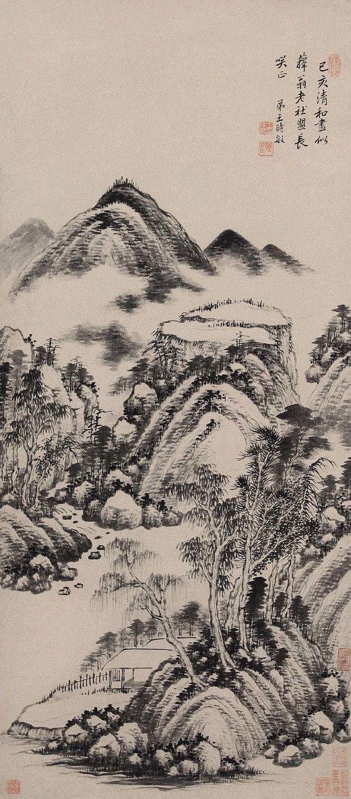 本幅作品取高远法构图,近景、中景、远景三段景物层次分明。近景处坡岸成丘,杂木挺秀;有高岗隔水相望,草木葱茏,是为中景;云烟缭绕之际,远山浮现,整幅作品构图饱满,气势雄浑。从笔墨技法来看,复古意味十分明显,皴笔细密,用多层次的皴染表现山体,墨色厚重,流露出作者“熟不甜,生不涩,淡而厚,实而清”的成熟面貌。