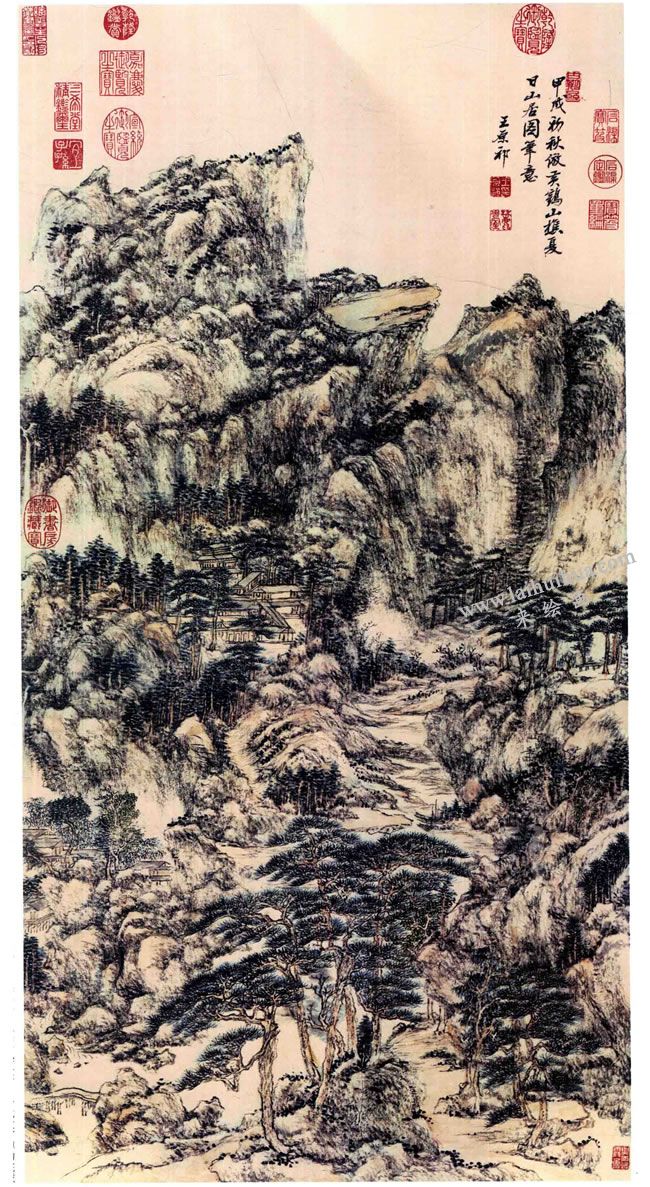 全图以块石累积作大山, 笔墨交融而层层入深, 先以淡墨着轮廓, 再逐次渲染, 又以干笔皴擦, 后以焦墨提醒. 画面仅有上方天空留白, 其余皆为深林重嶂所布满, 表现出林木苍郁之景象. 本院王蒙「丹台春晓」曾属于王时敏所有,「丹台春晓」画中强烈明暗虚实对比在此图也可见到,「墨须用淡, 要求淡裏之浓」此乃麓台题画语. 原祁画上经常充满着堆积、交叠平面块体, 其前后排列次序不同于宋元画中的垂直延伸方式。山石景物来回跳跃连接, 画面因空间互换而形成一股动势。