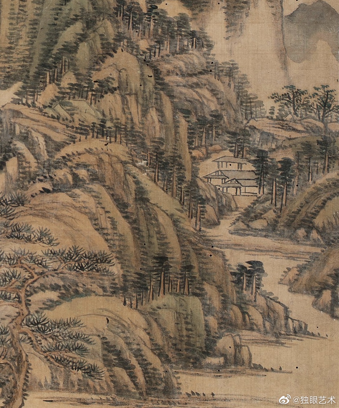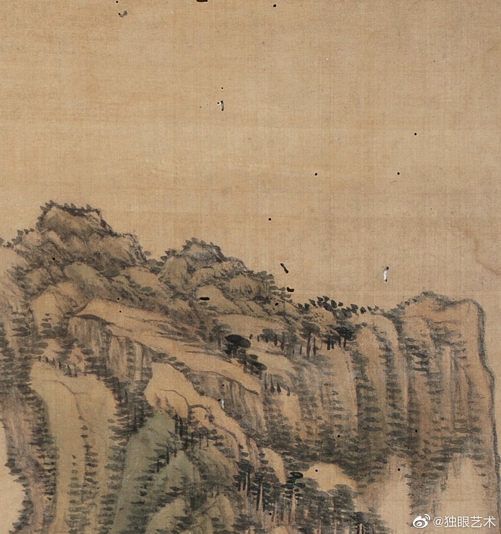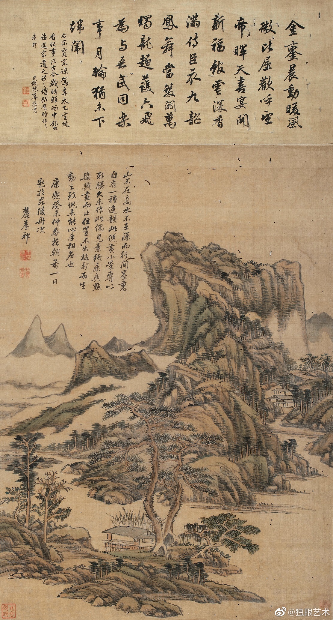 王原祁此作以山石堆砌法作崇岗叠巘,看似屑碎,其实浑沦。虽用绢,不能如纸本那样反复皴染,但依旧有苍拙古厚之气溢出画外,盖笔如金刚杵,元神入于缣素故也。