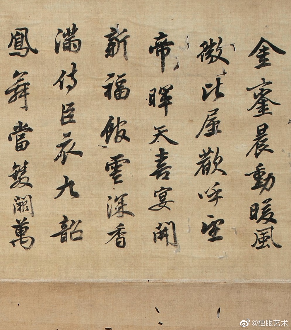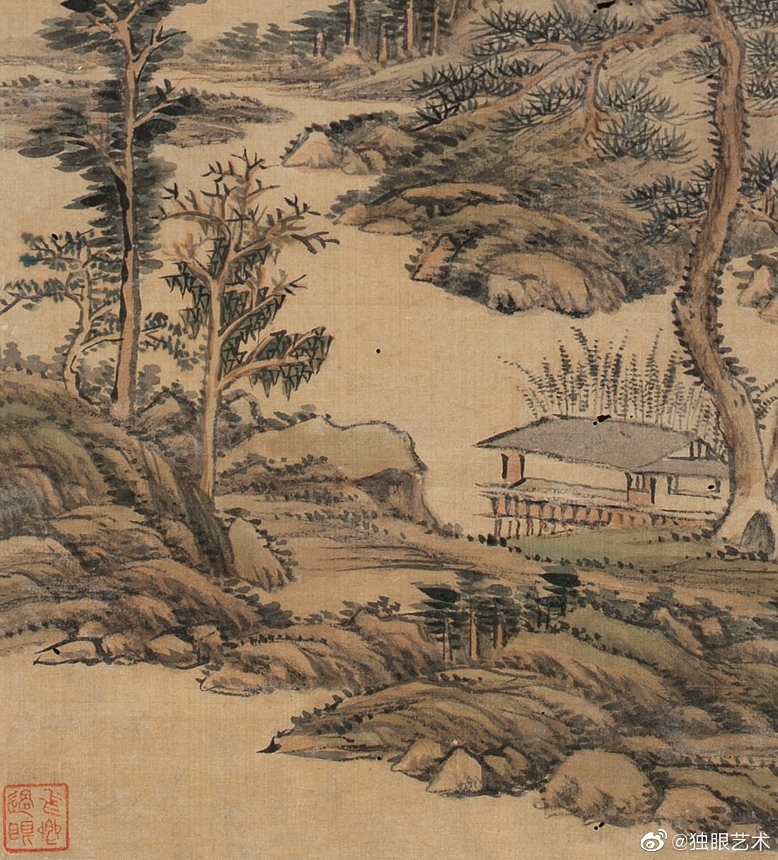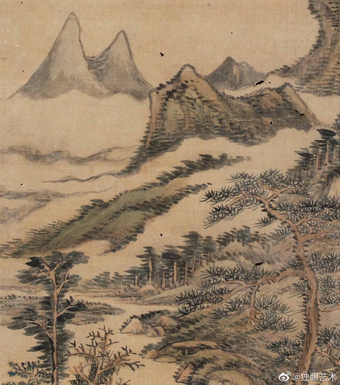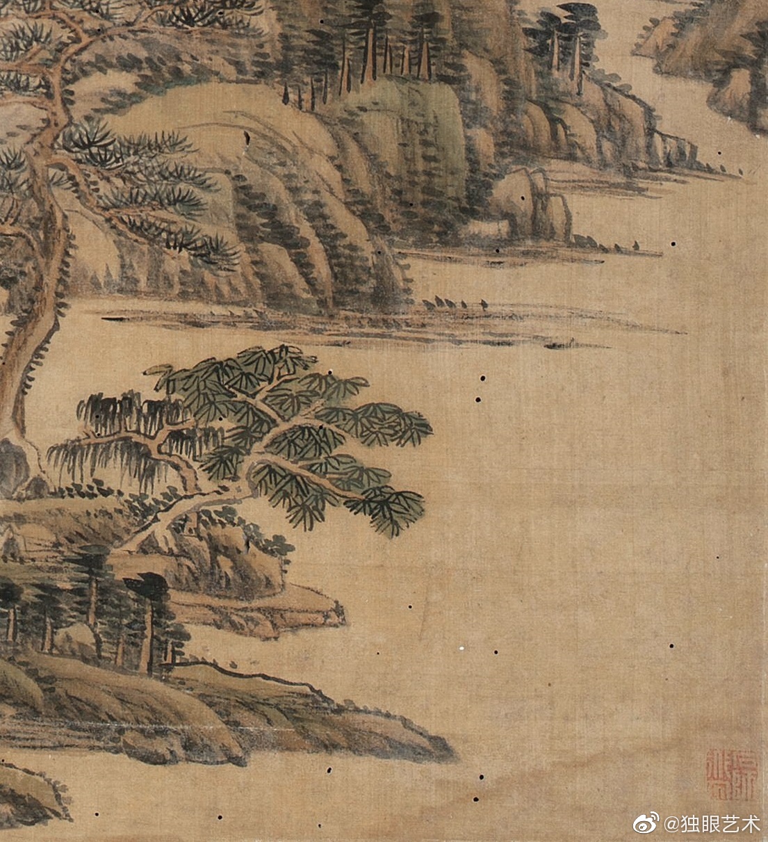王原祁此作以山石堆砌法作崇岗叠巘,看似屑碎,其实浑沦。虽用绢,不能如纸本那样反复皴染,但依旧有苍拙古厚之气溢出画外,盖笔如金刚杵,元神入于缣素故也。
