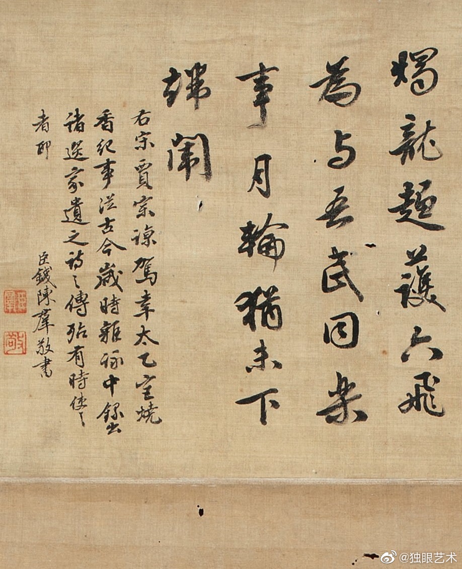 王原祁山水得祖父王时敏真传,一生醉心大痴(黄公望),而于吴镇、王蒙、高尚书、二米父子皆有神解。晚年笔墨有登峰造极之势,笔有金刚杵,墨有湛然色,华滋沉郁,卓然画苑,“清六家”中之翘楚也。此轴作于他五十五岁时,虽云法小米(米友仁),却兼黄公望之皴法,淹润华滋,浓湛中有淡宕之致,是其盛年之笔。上款为“浩修”,同年他尚为浩修仿《子久山水卷》(见《玉雨堂书画记》)。