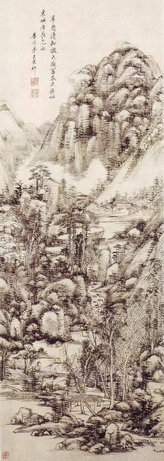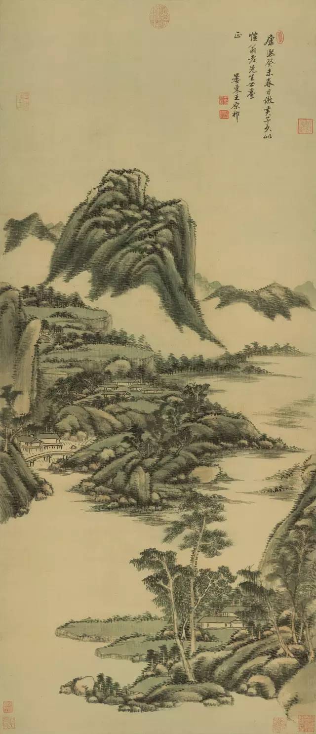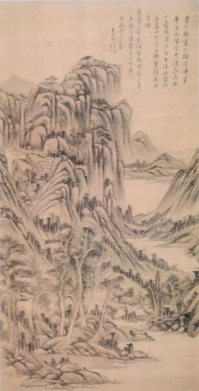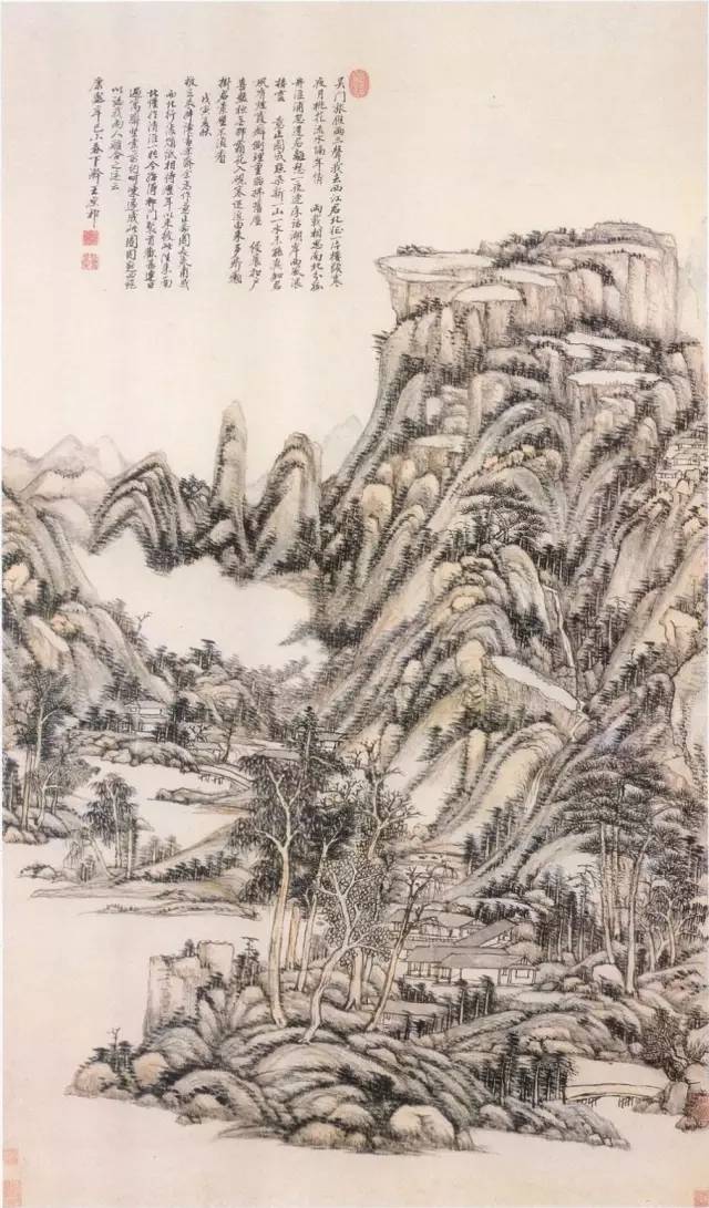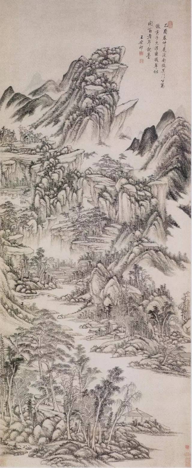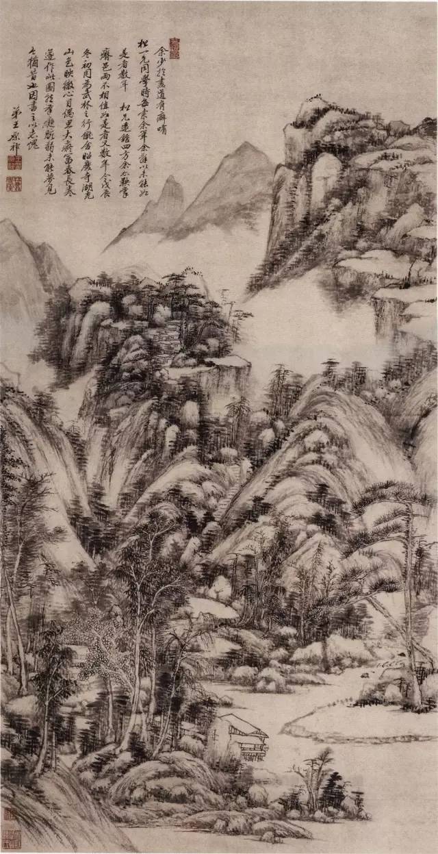 王原祁绘画主要受元代(公元1279--公元1368年)黄公望影响。作画喜用干笔,先用笔,后用墨,由淡向浓反复晕染,由疏向密,反复皴擦,干湿并用,画面显得浑然一体。承董其昌及王时敏之学,受清最高统治者之宠,肆力山水,领袖群伦,影响后世,形成娄东派(王原祁是江苏太仓人,太仓也称娄东),左右清代三百年画坛,成为正统派中坚人物。主张好画当在不生不熟之间,自出心裁,不受古法拘束,熟不甜,生不涩,淡而厚,实而清,书卷之气盎然纸墨外。清末娄东画派代表性画家与画论家秦祖永《恫荫论画》论王原祁:中年秀润,晚年苍浑。纵观王原祁一生的画风,其早年跟随其祖父王时敏,山水画直接渊源于祖父而面貌更强烈,笔墨气味亦更醇厚,致力于摹古,形式变化丰富,但缺乏生活气息和真是感受。早期作画面笔墨简淡,风格古秀。王原祁中年时期作品,从摹古中脱出,笔墨秀润,以《富春山图》为代表,画面云山秀水,用笔秀雅脱俗,没色清淡圆润。后又受王鉴指导,六十岁时作画能够“熟而后生”,如七十岁所作《南山积翠图》,笔墨与设色境界高妙。其用笔锋颖幻化,真率而意韵高古,生涩之处见纯熟。其用色绛翠斑驳,是浅绛和青绿手法的极致运用与融合。画面中累见笔笔交叠,色色相浸之处,全然不拘小节而直渲天然真趣。