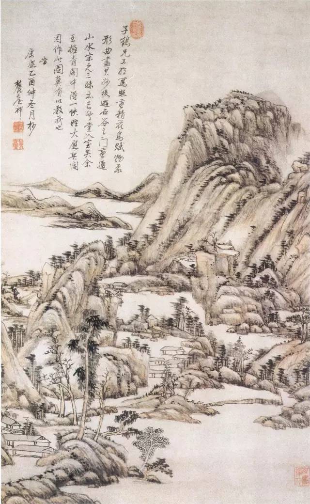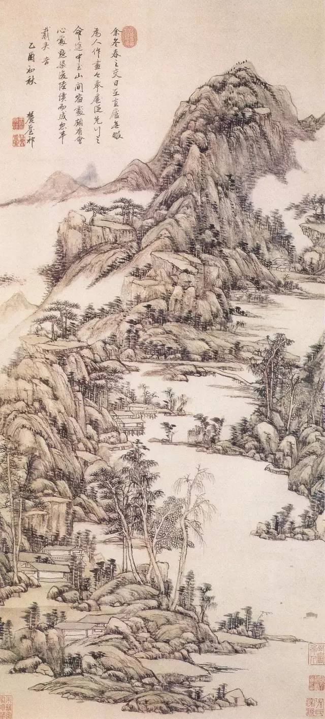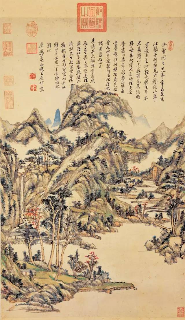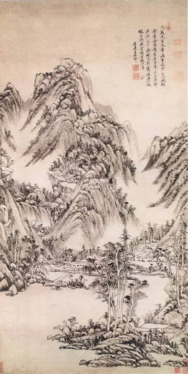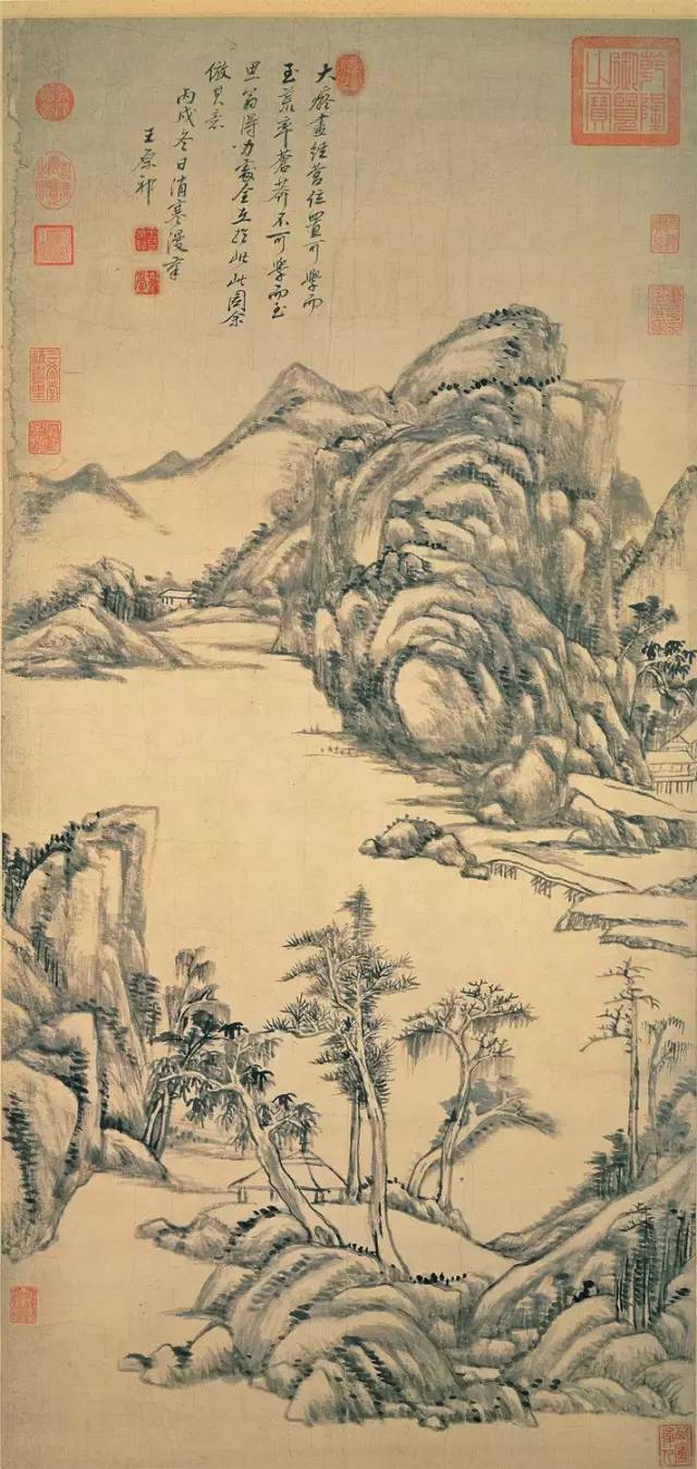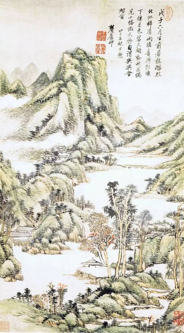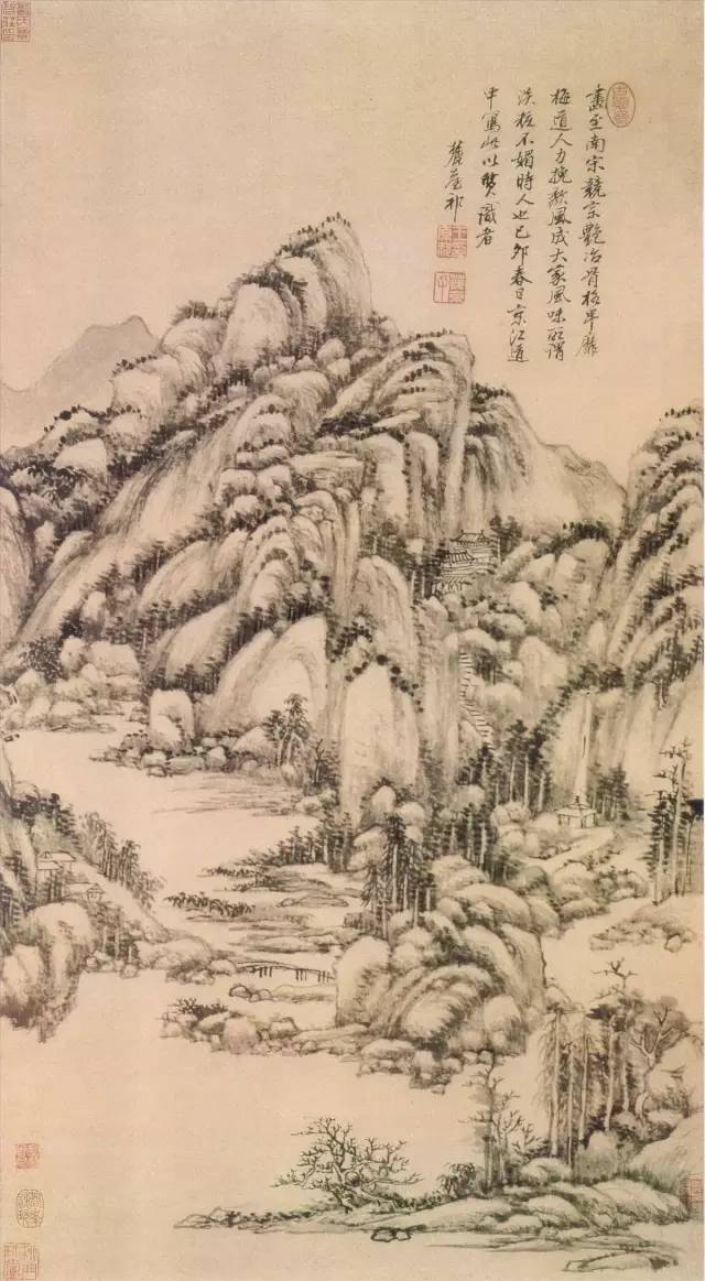 王原祁绘画主要受元代(公元1279--公元1368年)黄公望影响。作画喜用干笔,先用笔,后用墨,由淡向浓反复晕染,由疏向密,反复皴擦,干湿并用,画面显得浑然一体。承董其昌及王时敏之学,受清最高统治者之宠,肆力山水,领袖群伦,影响后世,形成娄东派(王原祁是江苏太仓人,太仓也称娄东),左右清代三百年画坛,成为正统派中坚人物。主张好画当在不生不熟之间,自出心裁,不受古法拘束,熟不甜,生不涩,淡而厚,实而清,书卷之气盎然纸墨外。清末娄东画派代表性画家与画论家秦祖永《恫荫论画》论王原祁:中年秀润,晚年苍浑。纵观王原祁一生的画风,其早年跟随其祖父王时敏,山水画直接渊源于祖父而面貌更强烈,笔墨气味亦更醇厚,致力于摹古,形式变化丰富,但缺乏生活气息和真是感受。早期作画面笔墨简淡,风格古秀。王原祁中年时期作品,从摹古中脱出,笔墨秀润,以《富春山图》为代表,画面云山秀水,用笔秀雅脱俗,没色清淡圆润。后又受王鉴指导,六十岁时作画能够“熟而后生”,如七十岁所作《南山积翠图》,笔墨与设色境界高妙。其用笔锋颖幻化,真率而意韵高古,生涩之处见纯熟。其用色绛翠斑驳,是浅绛和青绿手法的极致运用与融合。画面中累见笔笔交叠,色色相浸之处,全然不拘小节而直渲天然真趣。