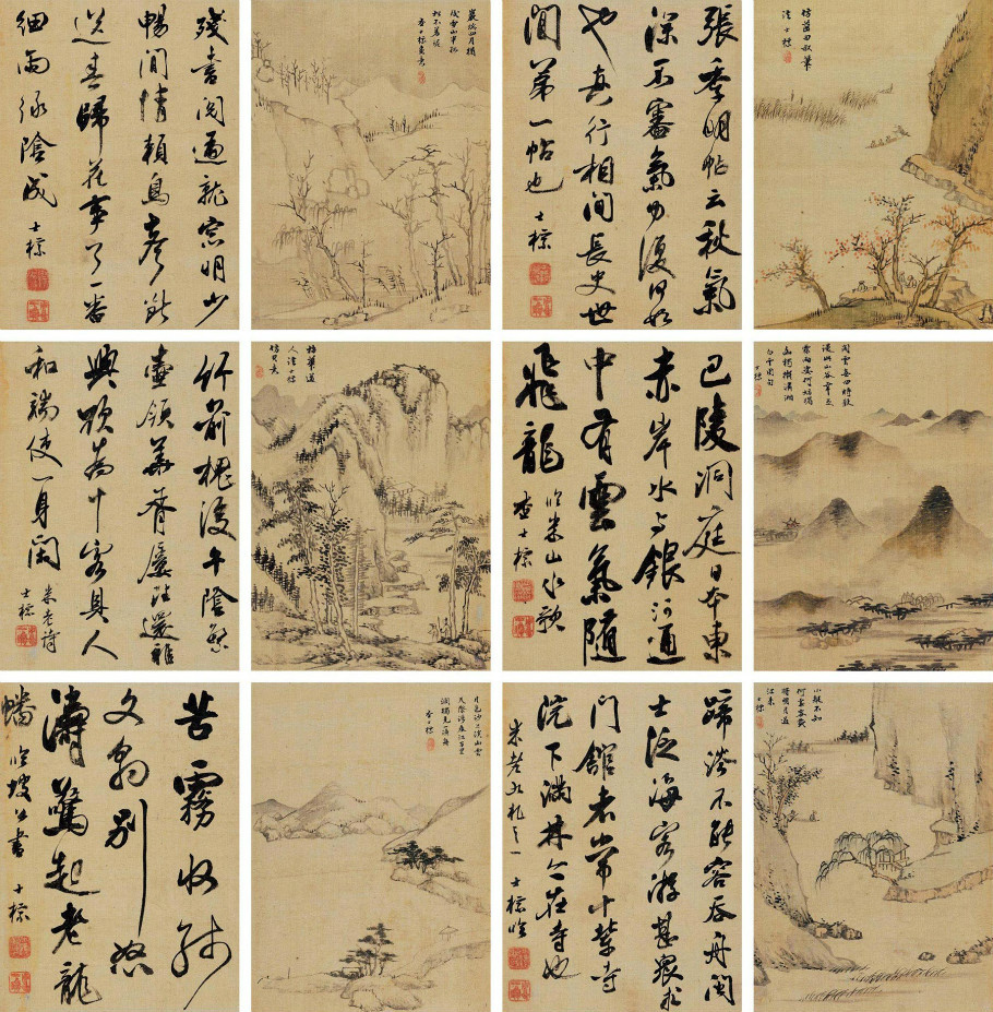 査士标《山水书法合册》,设色绢本,全册共十二开,每开纵22厘米,横16厘米。此作笔墨精妙,意境深远,虽多为仿古之作,却能在寸尺间显现出极强的个性。