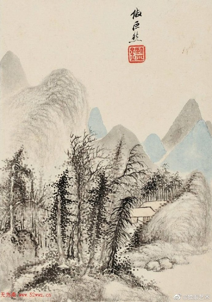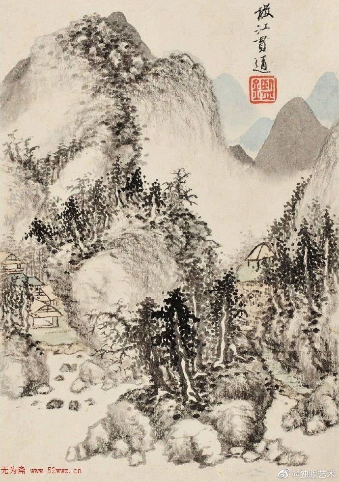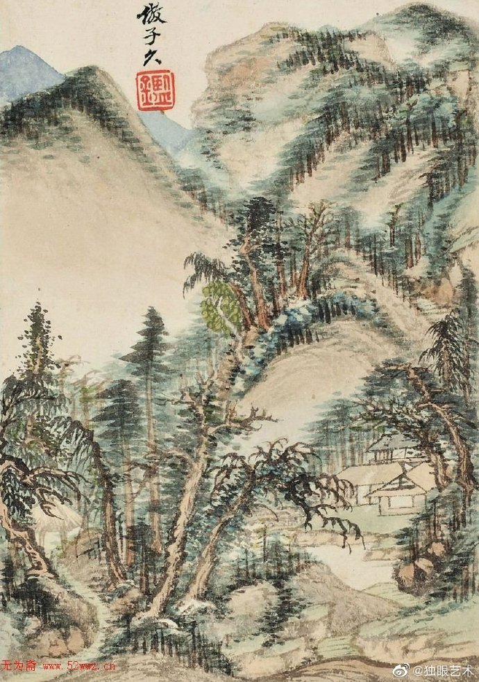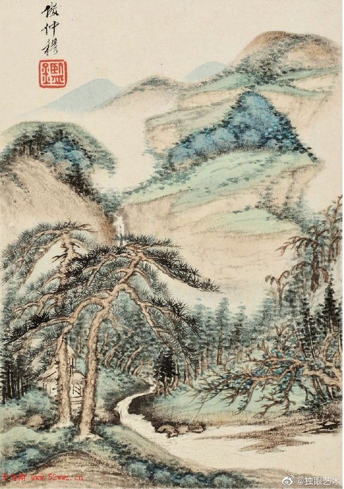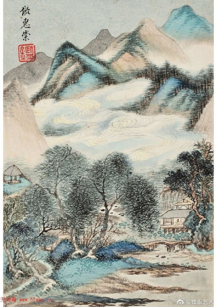 元四大家风格各殊,其源流皆出于董巨。王鉴擅山水,于董巨有很深的造诣,追摹董源、巨然,拟仿宋元诸家,近以董其昌为师,多临仿之作,善于青绿设色,皴染兼长,自谓“皴擦无自撰之笔”。风格华润,树木丛郁,山壑深邃。间作青绿重色,亦雅致有余,而有自家风貌。