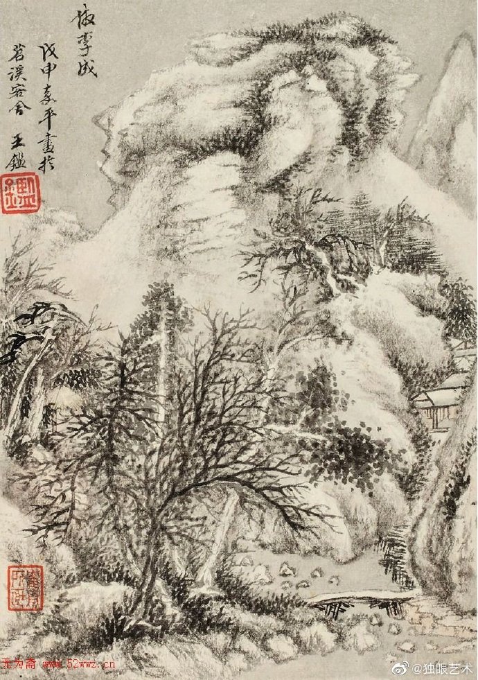 王鉴在“四王”中,与王时敏年龄相仿,也有人称“二王”,理由是,在清朝所谓正宗山水画系中,两先生有开继之功也。当然,这是站在仿古派立场而言。不过,王鉴的画艺确实不可低估。这位字玄照,号湘碧的太仓人氏,其祖乃是明代文坛“后七子”的领袖,大名鼎鼎的王世贞,世称弇州先生。王世贞平生甚喜收藏鉴赏,且著述颇丰,有《艺苑卮书》等专著行世,其艺术见解为诸多画家学者所信服,推崇。生长在这样一个家庭里,王鉴中年曾做过官,但他最终还是以画家身份了其一生。