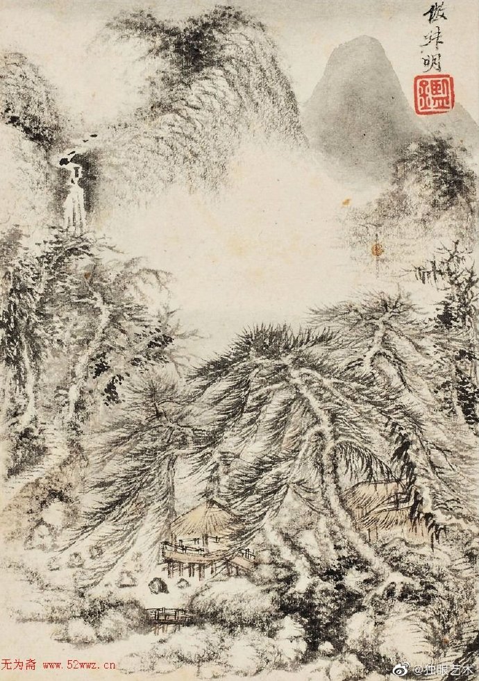 王鉴一生以黄公望山水画法入手,黄公望存世之作,无一笔不从董巨中来,幽微淡远,不染一丝画院习气,可谓元代第一家。王鉴学黄而不拘泥于黄,谨严之中富于变化,即在摹古中力求变化,注重笔墨之美,以取法自然为上。此图是王鉴为友人移居而作的,远山暮霭,层层叠叠,近处是杂树,小桥流水,山间丛林茂密,点缀村舍、茅亭,水中则有渔舟垂钓。山和水的布置疏密得当,层次分明。笔墨简约利落。山石的勾、皴,用笔顿挫转折,随意而似天成。绘画全仿子久,而用笔皴法仍师董源,有董巨之功力,又有子久之逸韵,瓶盘钗钏镕成一金,即使黄公望复生,神妙亦不过如此,称得上是当时画坛绝艺,可谓珠玉在侧。