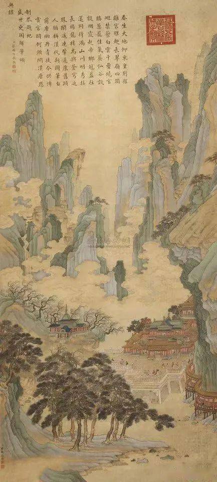 此画青绿为质,金碧为纹,勾线填色,山峰层迭,碧殿朱廊,工丽周密而精到;云霞飘渺,岩岭幽深,笔墨苍润恬静,整幅画在金碧辉煌富丽华美中透著静谧,画的意境已不用赘述,因军机大臣梁国治的奉命题跋已阐释详尽:“春生大地仰东皇别馆 离宫雅趣长翠岭四围回禁御白云千叠绕宫墙葱茏佳气蒸仙谷靉