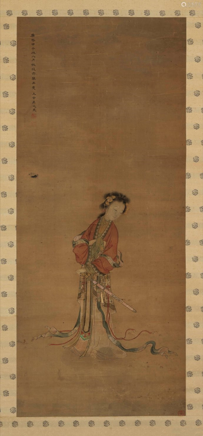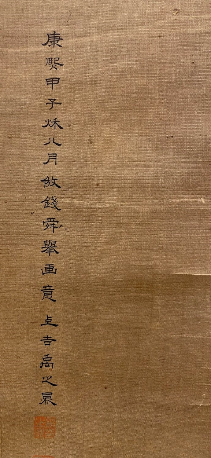 康熙甲子秋八月,仿钱舜举画意,上吉禹之鼎。禹之鼎印、上吉禹之鼎,中国清代画家。字尚吉,一字尚基,一作尚稽,号慎斋。后寄籍江都。擅山水、人物、花鸟、走兽,尤精肖像。初师蓝瑛,后取法宋元诸家,转益各师,精于临摹,功底扎实。肖像画名重一时,有白描、设色两种面貌,皆能曲尽其妙。形象逼真,生动传神。