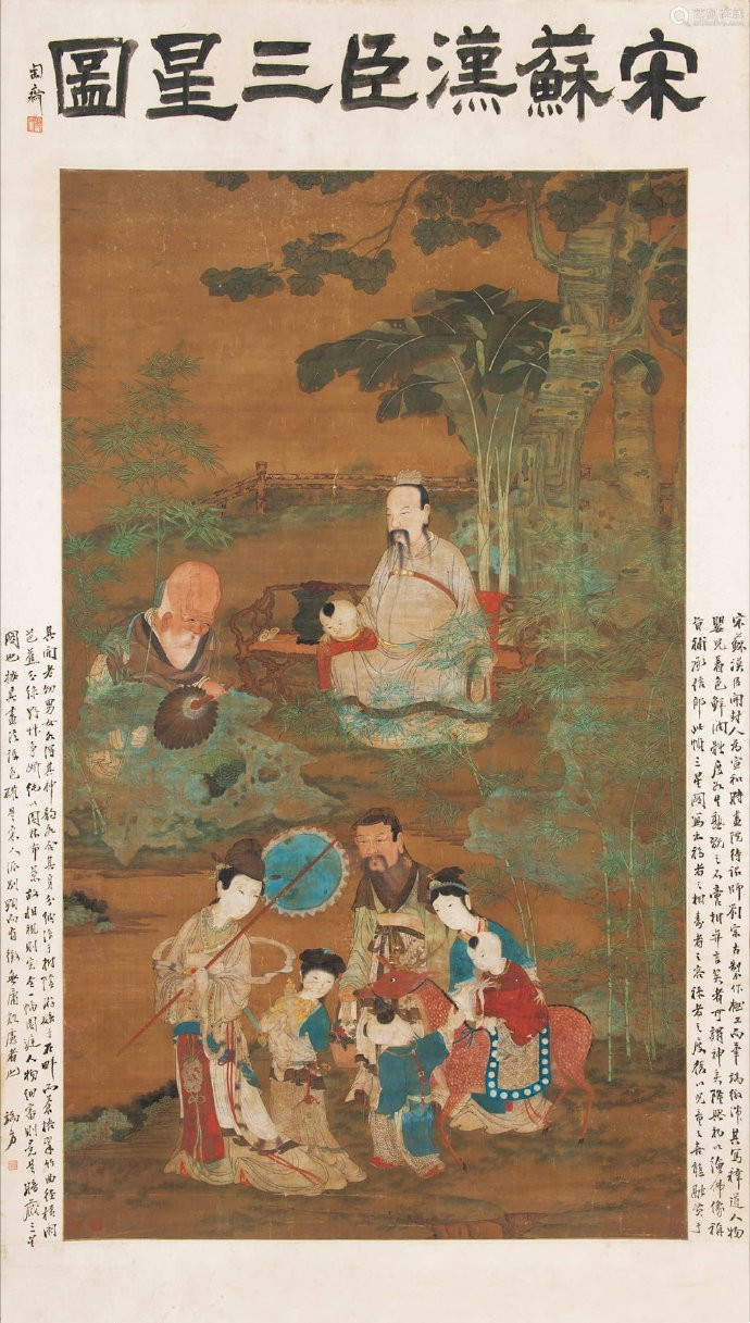 端方题边跋:宋苏汉臣开封人,为宣和时画院待诏,师刘宗古,制作极工,而笔端微滞,其写释道人物……其间老幼男女各得其神韵,各合其身份,纳凉于树荫,游嬉于石畔,而苍梧翠竹曲径横阑,芭蕉分绿,野草争妍,纯以园林布景,故粗视则完全一副园庭人物,细审则竟是暗藏三星图也,按其画法设色确是宋人派别,显而有微,毋庸疑虑者也。端方。钤印:端方阮元过眼苏汉臣,汴京人,北宋画家。北宋徽宗宣和年间任画院待诏,师刘宗古,工画道释、人物臻妙,尤善婴孩,所画货郎图,描画精细,货物繁颐,更为特出。所绘人物、士女及佛道宗教画,用笔工整细劲,着色鲜润。尤擅描绘婴儿嬉戏之景和货郎担,情态生动。