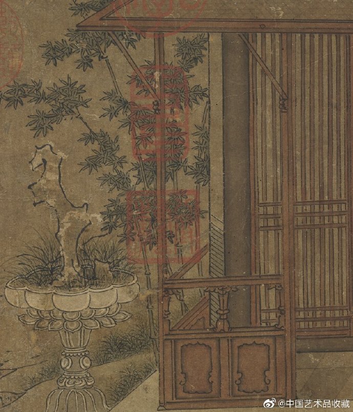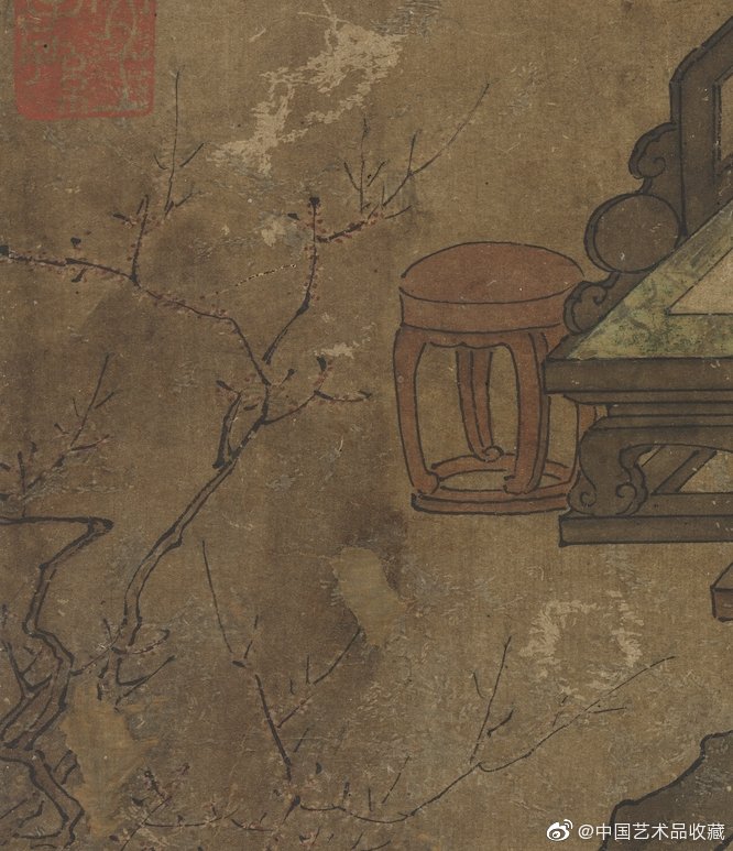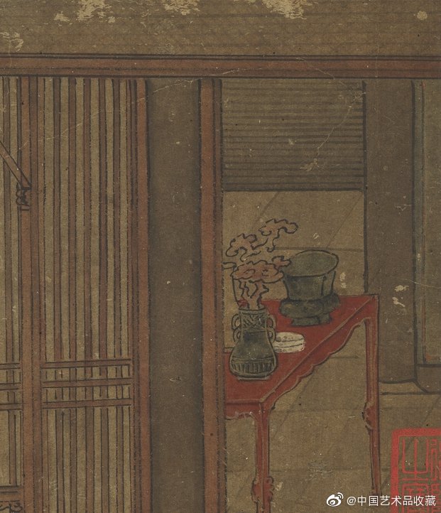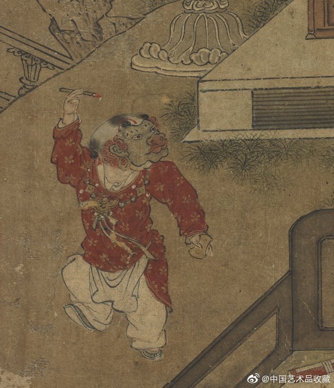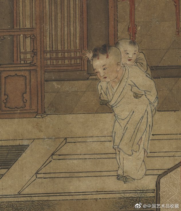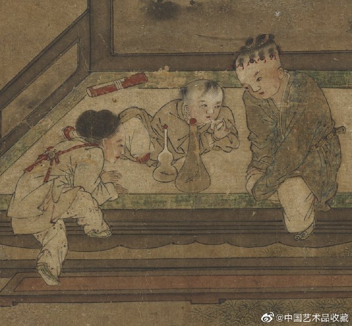 此图旧题苏汉臣,但实际上创作的年代可能是明末清初,无论画风或图中童玩都和宋代相去太远。值得一提的是图中卧在褟上的小孩手中挐的是清代童玩的一种,名叫「扑扑登」,是种用琉璃做的童玩,现在恐怕是是见不到了。