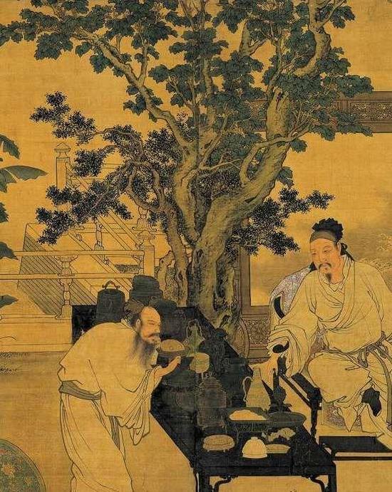 此幅为双拼巨幅,原画可能曾被裱装成立屏。主题除了鉴赏古器,也在描写琴棋书画等文人的游艺活动。画风秀雅古朴,饶有南宋院体余韵。杜菫此型工笔人物画,对唐寅中期风格,深具影响。