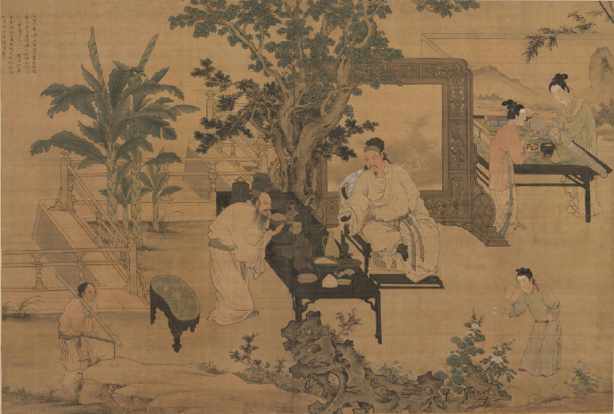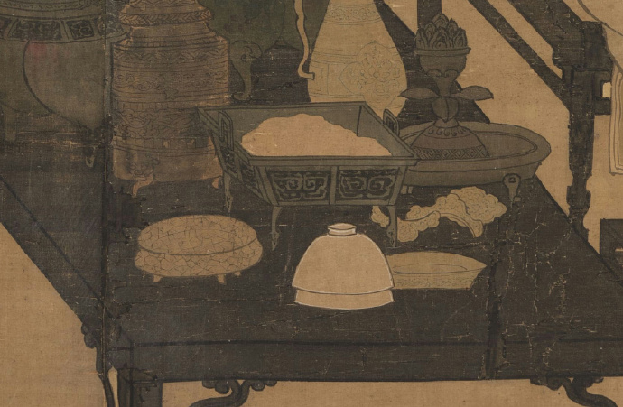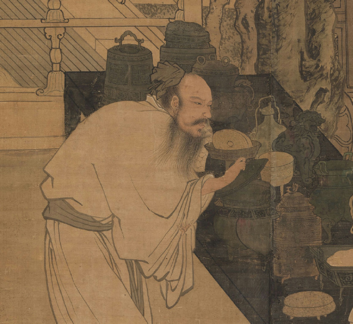 博古图是明代中晚期文人身份构建的产物,现传世的杜堇《十八学士图》、仇英《竹院品古图册》皆是其类。此类画作多描写文人于庭院内把玩三代彝器、观赏书画、品茗作赋的场景,体现了明代文人所希冀的高古空间。