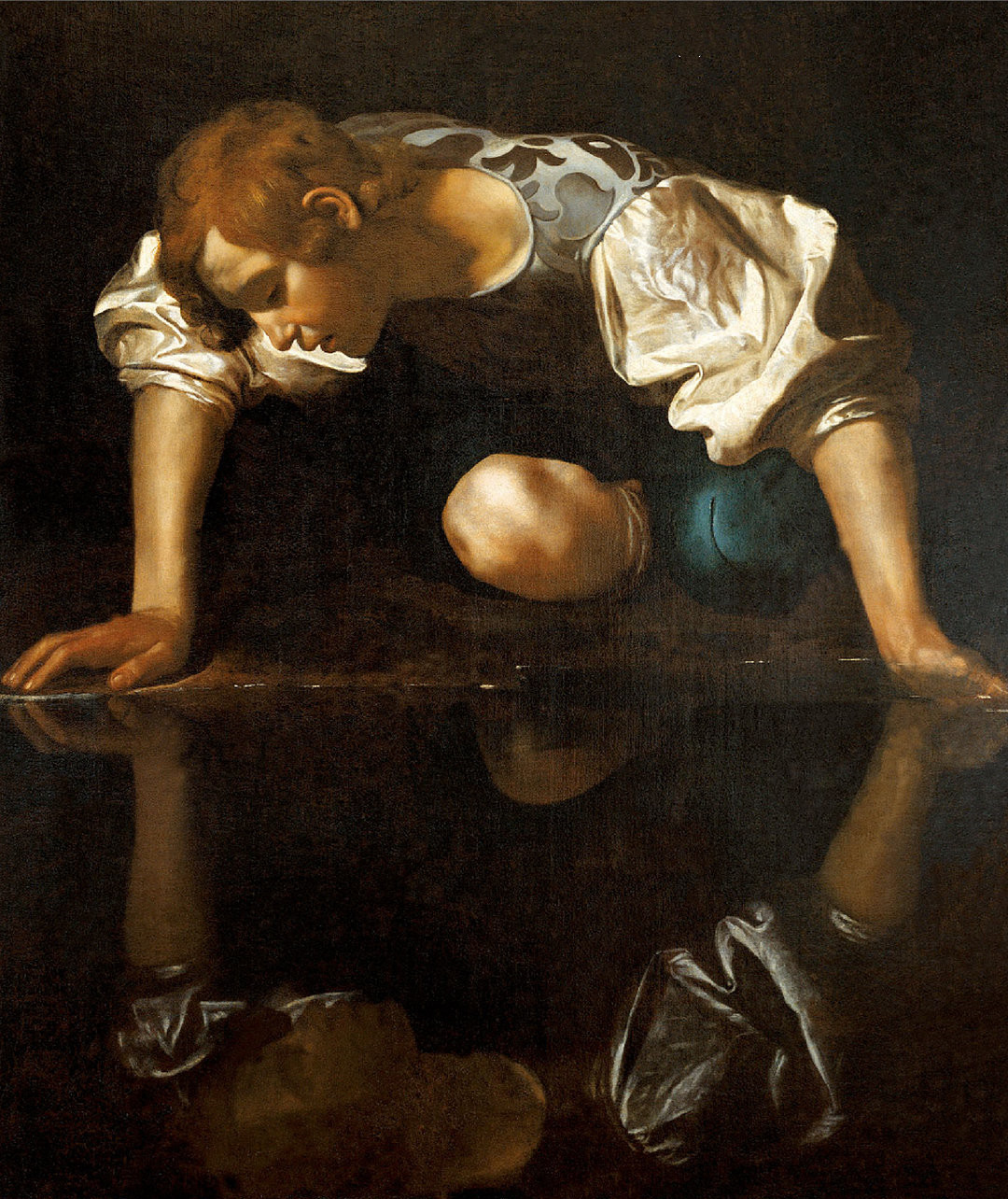 米开朗基罗 · 梅里西 · 达 · 卡拉瓦乔(1571—1610)持久的声名部分来自他不同寻常的人生,部分来自他辉煌的艺术成就。他的一生中有着惹事生非的臭名,因为赌博他杀了一个人,之后成为逃犯,在38岁的时候过早地死去。但是卡拉瓦乔也创造了有着惊人原创性的画作,成为他那一代人中最有影响力的意大利画家。《那耳喀索斯》是卡拉瓦乔职业生涯早期的作品,我们对他这个阶段的作品所知相对较少。不管如何,艺术家的一些标志性特征已经十分明显。他从最开始就喜爱把大型、被光照亮的人物放置在黑暗背景里,创造戏剧性效果,就像演员被聚光灯聚焦那样。他偏向使用具有感官性的年轻男子做模特。更加重要的是,构图虽然简单,但是足够吸引人的目光。那耳喀索斯和他的倒影形成了一个圈,围绕男孩聚焦的膝盖旋转。同样的效果也体现在卡拉瓦乔《大马士革路上的皈依》之中,画面聚焦在一只马蹄上。《那耳喀索斯》的主题来自奥维德。那耳喀索斯是一个英俊的青年,因爱上了自己的倒影,逐渐憔悴而死,他死后变成了现在仍以他名字命名的花朵(水仙花)。画中倒影里令人心碎的神情已经暗示了他的命运。神话题材在卡拉瓦乔的作品里十分稀见,关于这个委托的具体情况我们不得而知。