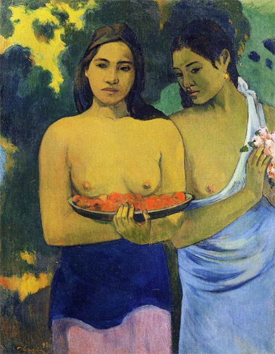 高更43岁时,离家弃子到了大溪地岛,在这里拼命作画,直到1903年他因麻风病去世。《两位大溪地妇女》是他定居大溪地岛后作的,画面采取了大面积平涂色块,在从黄色到各种深浅不同的绿色的色彩结构中,现出两位妇女的轮廓,虽说是线造型,但人物头部和手臂却是以微妙的明暗变化来表现的,她们像浅浮雕一样出现在背景上。画面上强烈的阳光使土著居民晒成棕赭的肤色、鲜红的果物、苹果绿的腰裙以及背景的深黑都构成鲜明的对比。高更在创作中把这一切都稚拙化了,色彩如此鲜明、纯粹,如同发着刺目的光彩,它的装饰性带来了粗犷的部落生活气息,赋予画面以特殊的风采。他的这种色彩技法,对后来的野兽主义画派产生了强烈的影响。