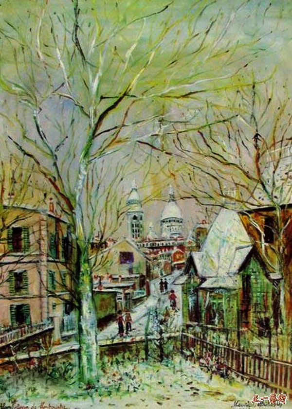 郁特里罗是以画城市街景为主的法国画家,他画遍了蒙马特尔的大街小巷。蒙马特尔在哪里呢?风光旖旎的塞纳河右岸,巴黎第十八区的城郊结合部,隆起一座130米高的小山丘,它就是巴黎著名的风景区,蒙马特尔高地。这幅《蒙马特尔》的画面处理得幽静而简朴,构图优美。楼房的窗户与街道商店的门被画成黑色块,街道上行人稀少,树木显得萧瑟,枝叶无几,统统笼罩在深秋或冬日的天空之下,散发出惨淡而忧郁的气息。可以看出,画家运用古典简朴的处理方法,造成建筑主题的简化,形成一种半抽象的写实画风。作者:莫里斯·郁特里罗(Maurice Utrillo 1883-1955),1883年12月26日诞生于巴黎。他的身世非常奇特,郁特里罗的母亲苏珊娜·瓦拉东本身就充满了传奇:她是一个私生女,也是一个绝色美女,曾经做过裁缝师、马戏团的艺人,后来成为当时画家们最喜欢画的模特。雷诺瓦的名作《城市之舞》里那位与一位绅士翩然起舞的女子就是她。莫里斯就是苏珊娜·瓦拉东当年拥有众多画家情人时的结晶,他到底是谁的孩子,估计连瓦拉东自己也搞不清楚。“郁特里罗”这个姓是跟随瓦拉东的同居人摩尔利斯·米凯尔·郁特里罗的姓氏。苏珊娜·瓦拉东后来也成为一名画家,并且和自己儿子莫里斯的朋友,比她小20岁的安德烈·尤特尔结婚。郁特里罗的性格与他充满旺盛生命力且性格刚强的母亲截然相反,他对自己人生的看法极其晦暗,常常酗酒度日,意志薄弱。直至生命终结之时,仍然受困于自己身世的阴影与酒精的魔咒中。在法国,郁特里罗与好友莫迪里阿尼被人们称为[受诅咒的画家],两人都拥有自我毁灭性格的倾向。郁特里罗开始学画其实是医生建议瓦拉东协助治疗他酒精中毒的一种尝试。由于郁特里罗性格孤僻,所以他的画风与其他画家没有任何关联,完全是他自己创造的,他从来没有受教于任何一所美术学校,自我摸索学画,并受到母亲瓦拉东的影响。他透过母亲来熟悉艺术的最新动向,在他初期的作品中,可以看到印象派画家毕沙罗与希斯里的痕迹。他一生大概画了3500幅油画,几乎所有的画都是描绘他的故乡,他最熟悉的、每日生活的城市。这些作品是充满乡愁的美丽的巴黎风景,这些质朴而优美的作品尤其受到人们的喜爱,对于法国民众而言,对“巴黎之子”郁特里罗作品的深厚情感,直到今天依旧不灭。
