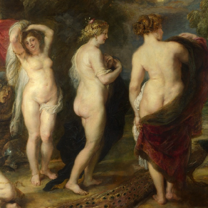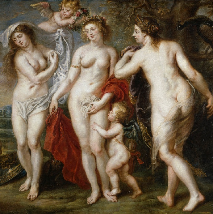 弗拉芒巴洛克(Flemish Baroque)大师鲁本斯(Peter Paul Rubens,1577 – 1640)绘制过许多“帕里斯的裁决”(The Judgement of Paris),其中有两版木板油画作品最为著名。第一版大约作于1636年,尺寸为144.8 cm × 193.7 cm,现藏于英国伦敦的国家美术馆(National Gallery);第二版作于1638到1639年间,尺寸为199 cm × 379 cm,现藏于西班牙马德里的普拉多博物馆(Museo del Prado)。两个版本的作品都展现了鲁本斯心中的理想女人体,而这两幅作品也正好从两个角度再现了这一神话场景,让观者置身其中,全方位地观看帕里斯的审判。