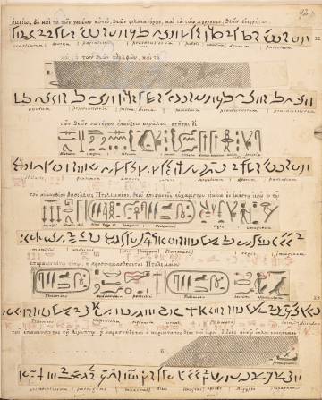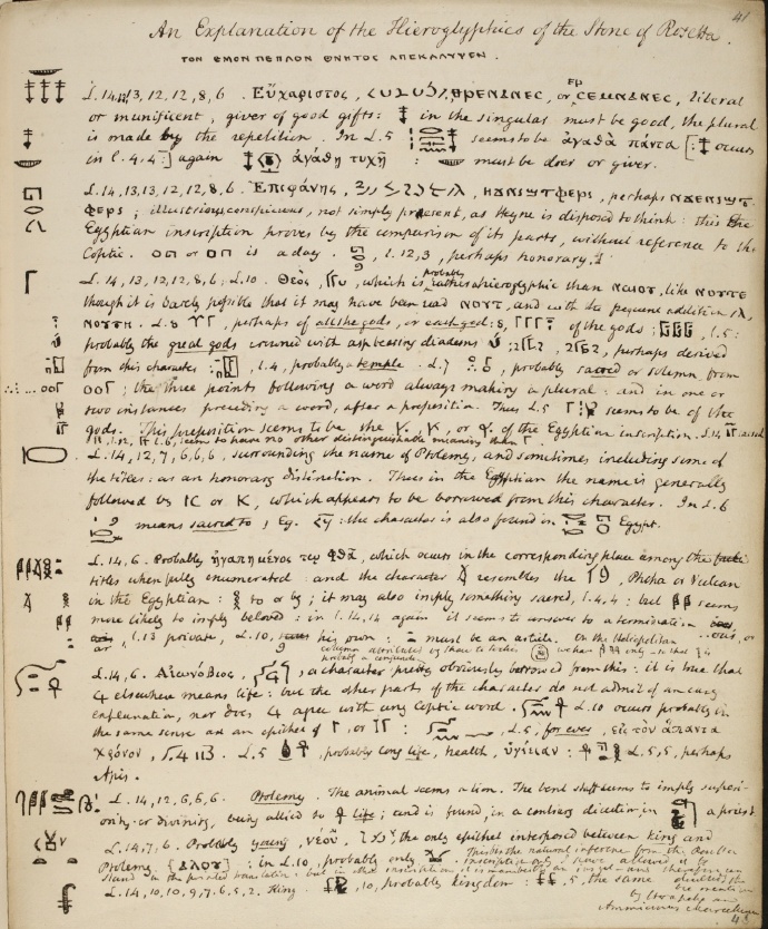 英国学者托马斯·杨 (Thomas Young) 是最早尝试破译古埃及文字的欧洲人之一。他利用罗塞塔石碑,结合古希腊文和世俗体平行文本,辨识出了世俗体文字中的一些表音符号,还确定了许多圣书体文字的含义。@大英图书馆 收藏了托马斯·杨19世纪古埃及考古手稿,共5卷。