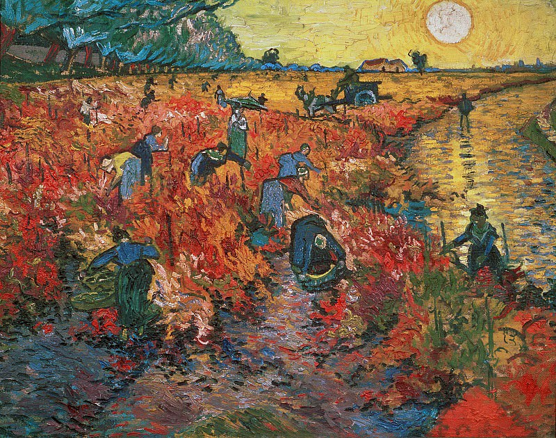 画家立即命令车夫停住马,下了车,开始画风景,试图捕捉那令他的想象力难以自拔的时刻·阿尔勒的红色葡萄园诞生了·批评家和那些对艺术家的作品不感兴趣的人试图嘲笑这幅画,说上面的一切都不自然,尽管还有什么能比傍晚夕阳下简单的农民工作更美丽和自然·