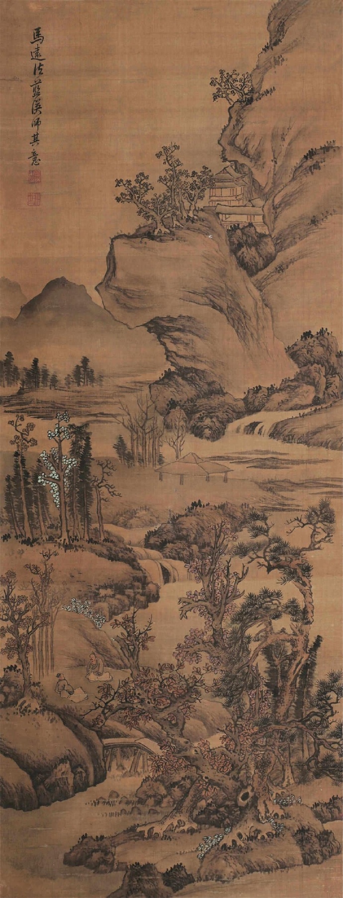 蓝瑛《秋山客话》立轴,设色绢本,尺寸:175×68cm。款识:马远法蓝瑛师其意。钤印:蓝瑛之印、田叔父。