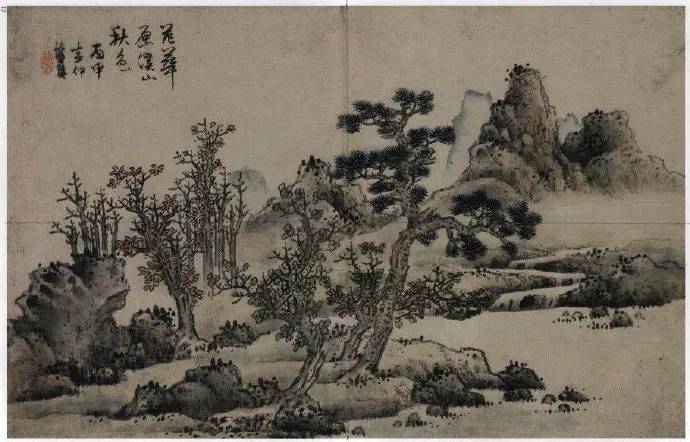 蓝瑛《范华原溪色图》,款识:范华原溪山秋色,丙申春仲,蓝瑛。