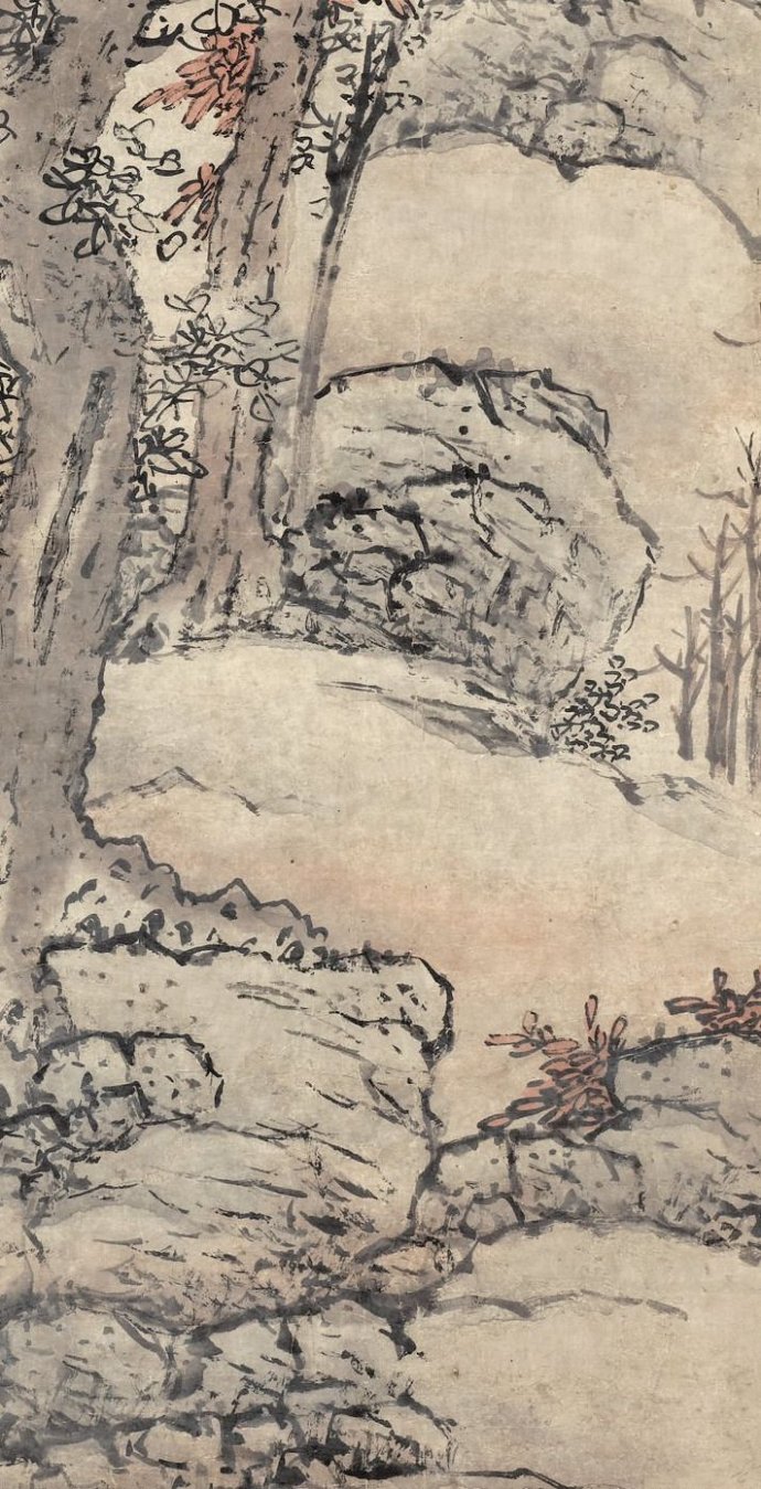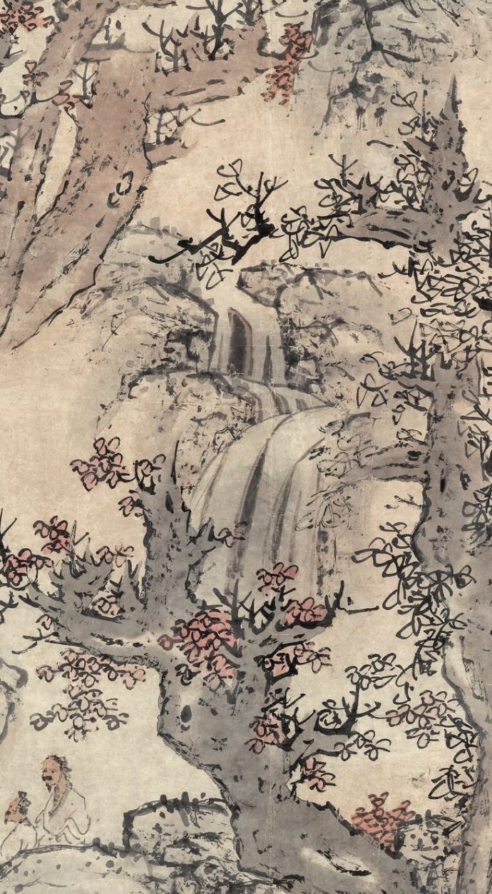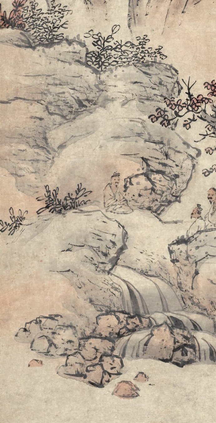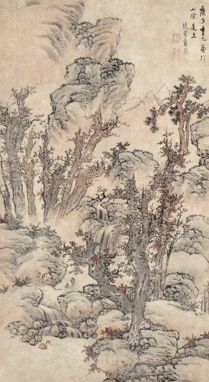 蓝瑛《秋山清话图》,立轴,设色纸本,尺寸:148.5×81.5 cm,约10.9平尺。庚子(1660年)年作。题识:庚子重九,画于山阴道上。蜨叟蓝瑛。钤印:蓝瑛之印、田叔。