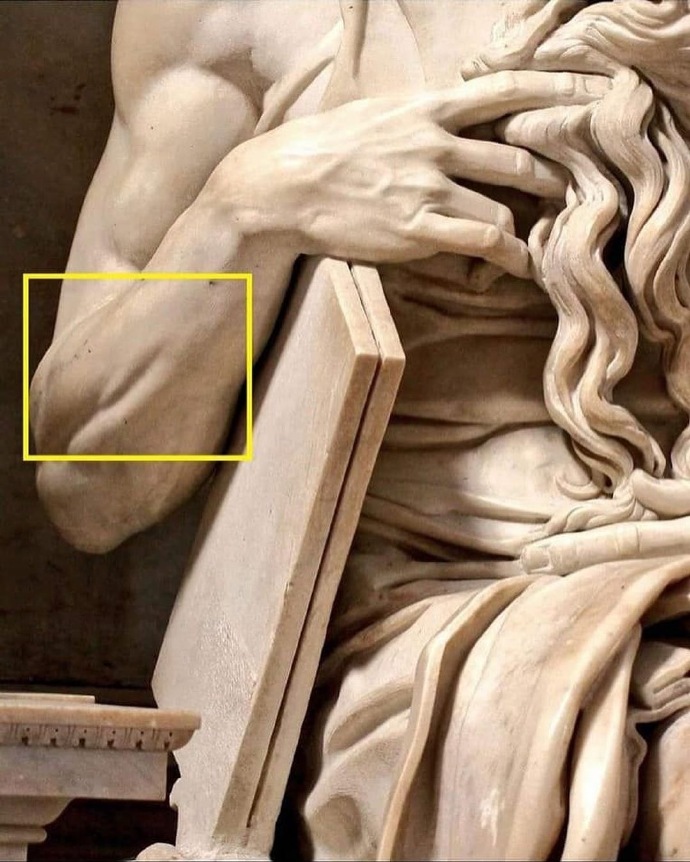 在米开朗基罗的《摩西》中,前臂上雕刻着一块小肌肉。人体只有在抬起小指时才会收缩这块肌肉,否则它就会被隐藏起来。