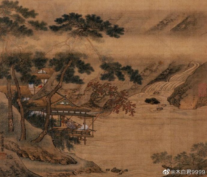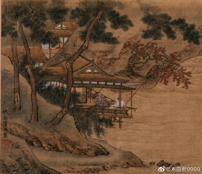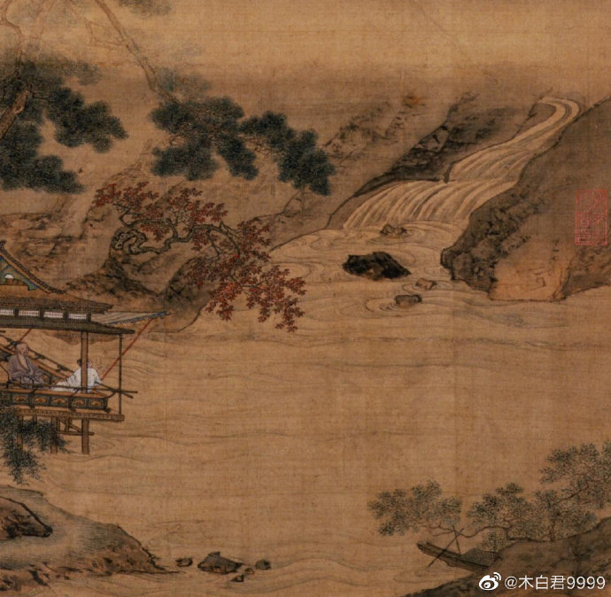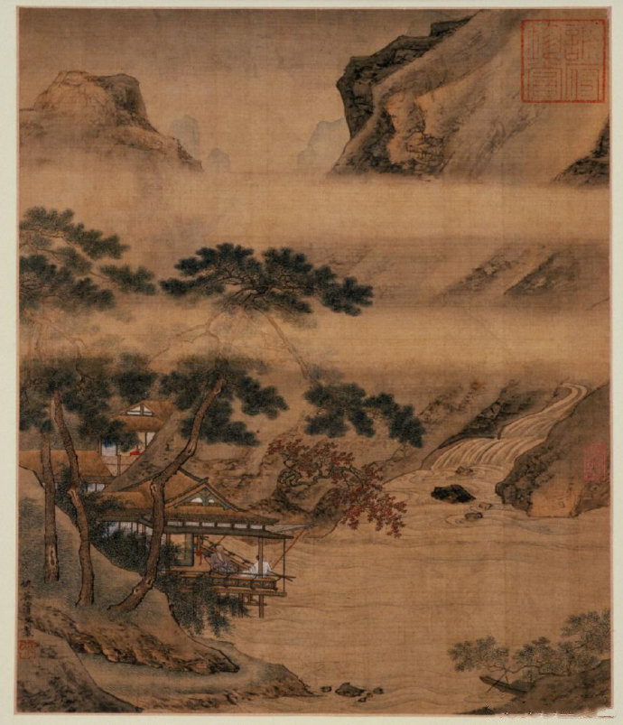 明.仇英《临溪水阁图》,绢本设色,纵41.1厘米,横33.8厘米。现藏于北京故宫博物院。
