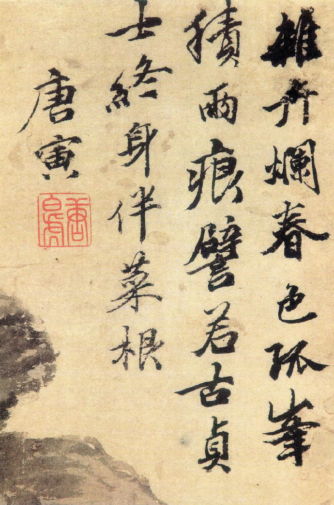 自题诗:“杂卉烂春色,孤峰积雨痕。譬若古贞士,终身伴菜根。唐寅”