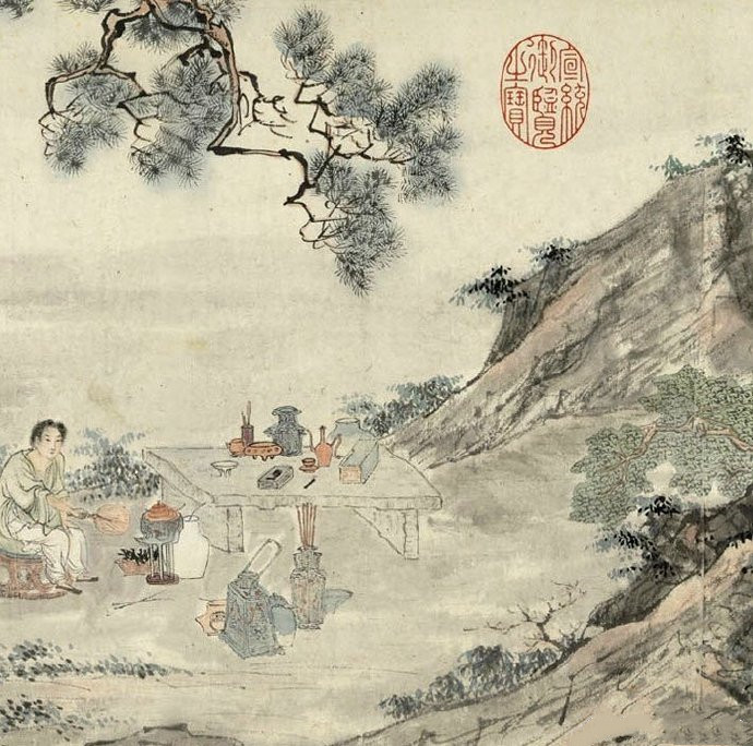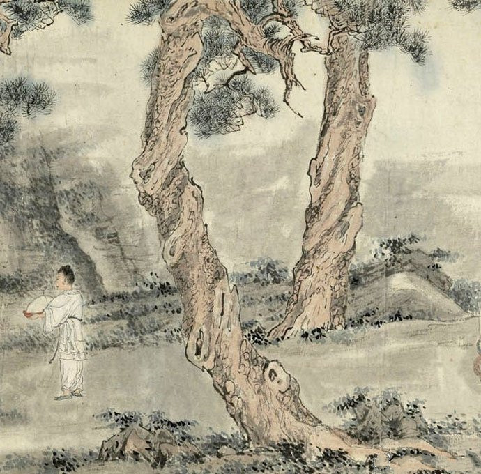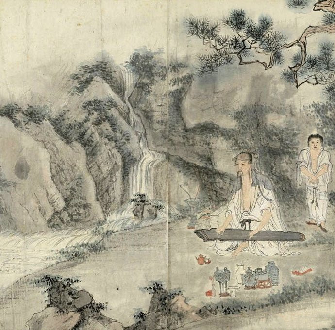 《琴士图》画面描绘了在松林泉石间,琴师杨季静身着象征高士的陶渊明衣冠,盘坐在水畔,抚弦弹琴,神态悠闲安详,溪水淙淙,似与琴韵相和。数位童仆正忙于烹茗煮茶,小几上与地上散列着书籍笔砚和鼎彝古玩,似乎是把风雅文人的书斋搬到了户外。悠扬的琴声正如高山流水,在山林间飘扬。