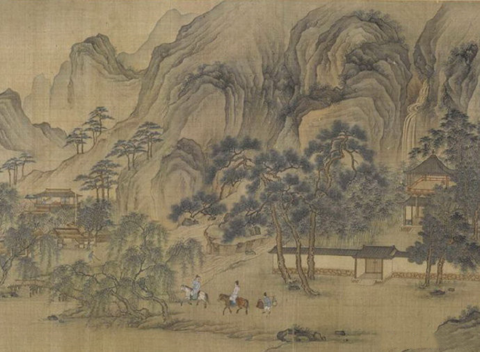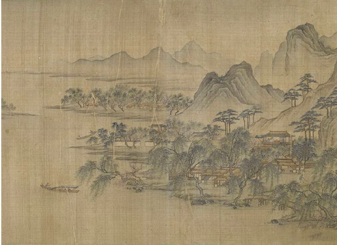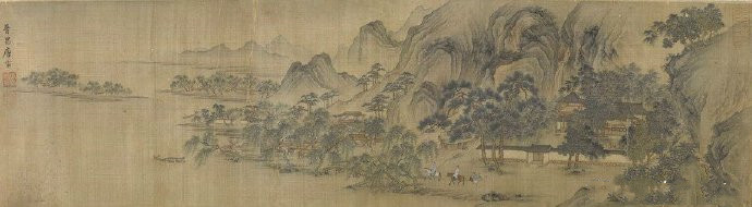 唐寅《水村行旅图》卷,绢本设色,纵31.4厘米,横115.2厘米;现藏于美国印第安纳波利斯艺术博物馆。