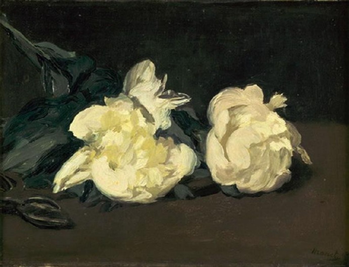 1864年马奈有了丰富的参考材料,画了一系列表现牡丹的画,牡丹是他喜欢的花,但是很难画,因为它凋谢得早,花瓣雨一般地骤落。画家画了第一幅画,画中他把达到不同成熟程度的花放在一只花瓶中,这样表现牡丹从花蕾至花瓣凋谢的生命的周期。他又以同样主题画了一幅较小的画,画中只有两朵牡丹花,放在整枝剪旁,整枝剪子的出现令人想到剪下来的花是肯定要死亡的。画家选择的深色背景使轮廓朦胧的白色和粉红色的花瓣的娇弱得以烘托出来,画是用画笔挥洒而成,笔蘸的颜料多而浓,有质感。简明地放在花的周围的绿叶丰富了辅助色点的组成,把花的主题固定在画的左上角。这些数笔画在布上的花,是画家献给自然主义先驱、他的朋友、也是库尔贝的密友、作家和艺术评议家尚弗勒里的,以表达对他所作出的有利于现代绘画的斗争的敬意。