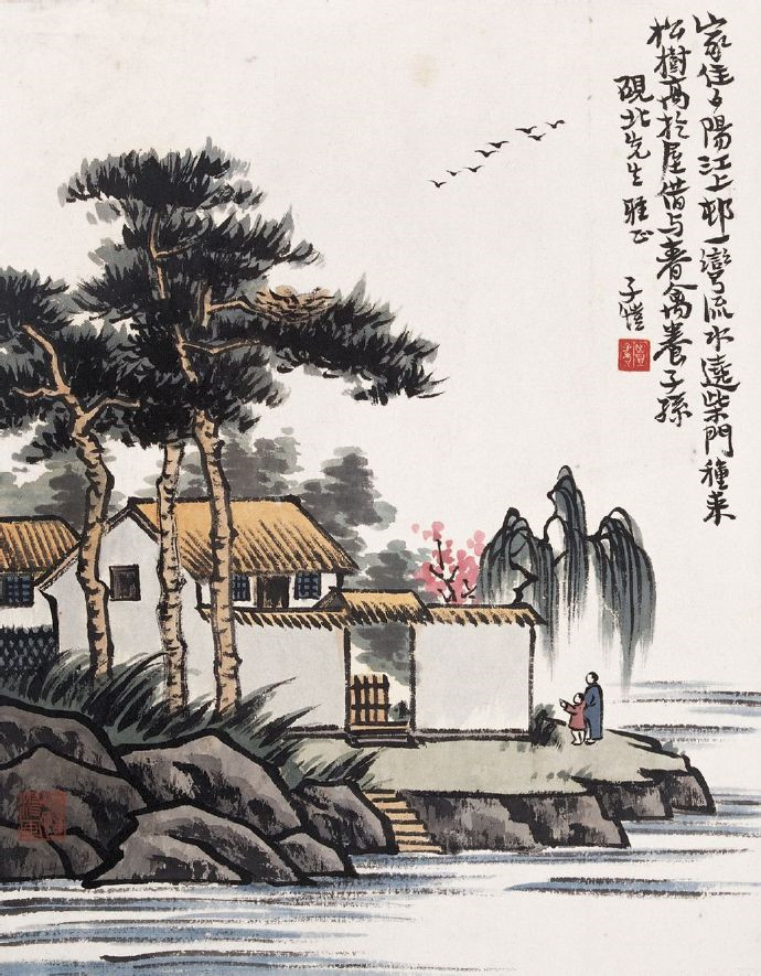中国艺术大师丰子恺,“家住夕阳江上村,一弯流水绕柴门,种来松树高于屋,借与春禽养子孙”。画中的庭院依水而筑,左插柳,右植松,绿草茵茵,红花朵朵,正是我辈向往的桃源胜境;后两句幽默诙谐,是他爱护群生的广慈之心的真情流露,人类只是自然界的一份子,与世间生灵互帮互助、和谐共处,那该多好