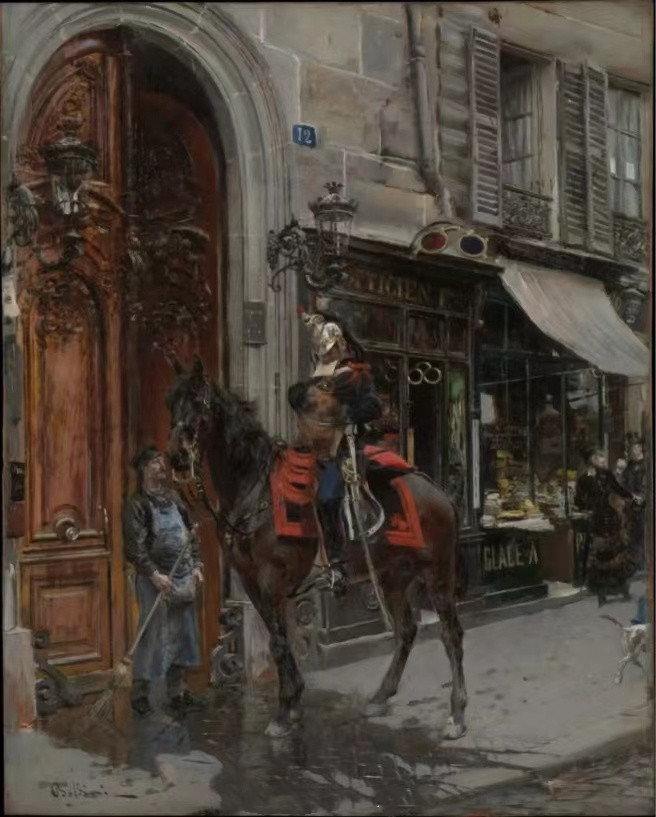 乔瓦尼·博尔迪尼(Giovanni Boldini)(1842—1931),意大利画家。其职业生涯基本上是在巴黎度过,在伦敦也有一定知名度。在19世纪末的时候,他已成为巴黎最有名的人像画家之一。博尔迪尼以线条大师著称,线条流畅,善于把先锋派的技法与传统的学院派的画风结合起来。在《快讯》一作上,画中士兵的包上部分可见的“garde républicaine(法国共和国卫队)”字样表明,他是代表巴黎市卫队递送信件的。他来得太早了,以至于门房还在清洗人行道,一对情侣在右边谨慎地道别,眼镜店外的大眼镜鼓励观众仔细观看。有评论家认为这幅画“有点冷漠和闪闪发光”,但称赞了它的生命感和快速的动作,并总结道:“博尔迪尼不仅仅是一位时尚画家。”