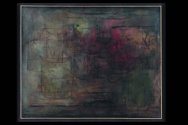 趙無極的1952年作品《停靠海港的船》(Boats in the Harbour)。現年91歲的趙無極自1948年起定居法國。一些評論家認為,他是當今健在的最重要的中國藝術家。