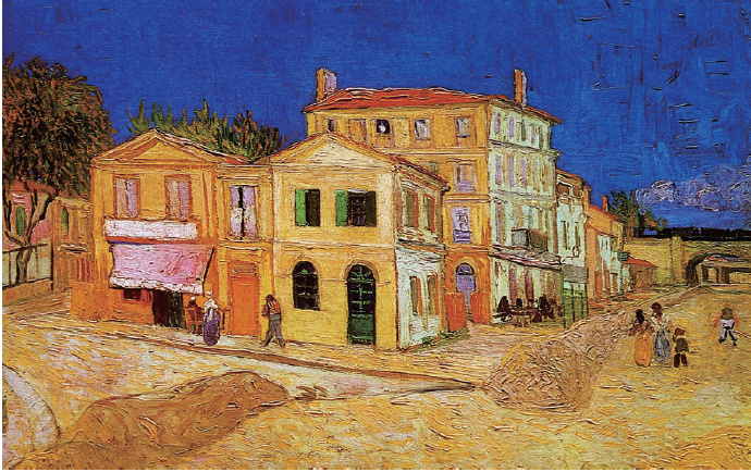 1888年2月,梵高在朋友推荐下来到法国南部普罗旺斯省阿尔镇,同年5月他在拉马丁广场租下了画面上的“黄屋”,并很快爱上了这儿。画室外墙的金黄,按照梵高自己的说法,来自阿尔这座年日照超过300天,号称“法兰西阳光之都”的小城,来自它灿烂的金色阳光。这金色的阳光让画家在短短3个月,画出一幅又一幅传世不朽的巅峰之作。这阳光让他沉醉,也让他痴迷;黄屋是梵高在阿尔生活的重心,他满怀希望地要把这里变成艺术家的殿堂。《向日葵》、《收获景象》、《夜间咖啡馆-室外》、《夜间咖啡座-室内》和著名的卧室图都是这一时期的代表作。