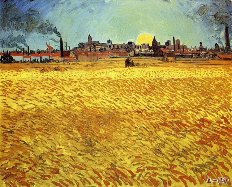 特别打动人心灵的,是凡高画了白日沉入阿尔的一幅画,《夕照下的麦田》。画中的阿尔是个躺在天边的黑色的长影子,看出已是工业时代了,有烟囱飘着两三道黑色长烟,走近它只有穿过那无边的金色的麦田,那轮坠入阿尔的夕阳,金光淡淡,它背衬的天蓝得发绿,它看上去就更像一轮沉甸甸的月亮,一寸一寸地露出脸庞。也许你会突然知道了这幅画特别打动人的,其实不是阿尔沉入了黑夜,夕阳落入了地心,也不是金光返照的辉煌麦田,而是黑蓝的晚景和金色麦田的交界线上,有两个彼此搀扶的微小人影,也像黑夜和麦田一样,一个黑衣,一个黄衫,他们在那里的样子那么仓惶茫然,孤独无依,仿佛身后幽冥般的阿尔城他们刚刚逃离出,而面前无边的金色麦田,他们敢进入里面吗?