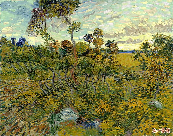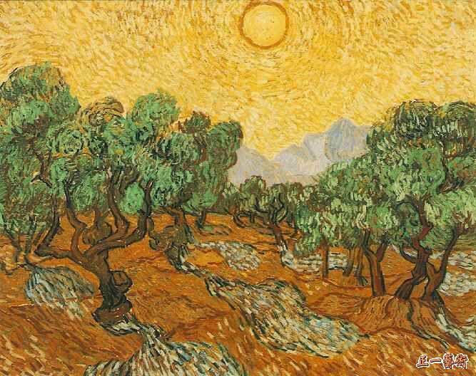 12、橄榄树和黄色的天空与太阳 1889年11月 布面油画 73.7x92.7cm 美国明尼苏达州明尼阿波利艺术机构 830