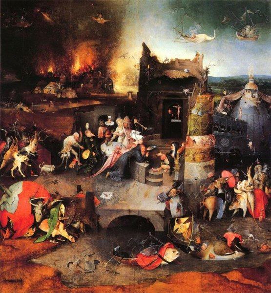 博斯的艺术作品充满中世纪社会末期普遍存在的对邪恶的困扰,包括恐怖、怪诞、可怕、神秘、虚幻、性与暴力,他擅长用象征手法和寓意语言来陈述邪恶。这幅《圣安东尼的诱惑》也不例外,我们可以看到一群妖魔在一个戴高帽、穿红披肩的魔术师召唤下,突然乱蹦乱跳地出现;还有一些人在奇形怪状且坍塌的建筑物前面大吃大喝,有人说这种情景是黑弥撒。而在画面的左上方,出现了熊熊烈火,遮盖了一部分的天堂。这似乎代表着,人类若不坚定自己的信念,不但随时会遭受到邪恶的引诱,甚至可能因此失去内心的平静而断绝了上天堂的路。