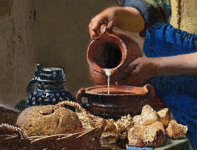 它描绘了简陋厨房的一个角落里,淳朴的妇人将陶罐中的牛奶缓缓倒出,阳光透过窗子照进来,屋子中的每一样物品都静静的,平淡无奇,却充溢着一种时光的空灵感和一种现实的崇高感,所有的一切统一在和谐的气氛当中。当把视线停留在一个个局部上的时候,我们会被画家描绘这些普通事物的耐心和技巧打动。桌布、毛巾、竹篮、铜壶、陶罐、面包、倒出来的牛奶、主妇专心致志的神态,甚至墙上的钉子和坑洞都得到充分的表现。画家在表现物体时描绘得很准确,在黄色、蓝色、白色三种整体的色调中,绝无刺眼和费力之感。它们给人的感觉是柔和的,却又都如此坚定存在着,生活的瞬间被凝固了,最平常的事物在这一刻呈现出它们各不相同的神奇与尊严。这幅画让我们以新的眼光看到了一个简单生活瞬间,令人难以忘怀。