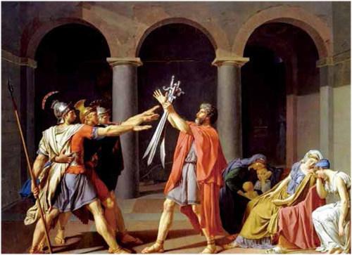 1782年,巴黎重新上演了大剧作家高乃依在1640年创作的诗剧悲剧《荷加斯》。故事写的是发生在古罗马时期的一个故事:在建立共和制的过程中,罗马城邦和伊特鲁里亚的阿尔贝城邦发生了战争,两个城邦打了好多年都没有分出胜负。最后双方决定各选派三名勇士进行决斗,哪一方胜利了,就有权得到对方的城邦。罗马城这一方选中了荷加斯三兄弟,阿尔贝城推举了居里亚斯三兄弟。这是一个不幸的结果,因为这两个家族虽然属于不同的城邦,但私下里却有很深的联姻关系。荷加斯兄弟中的老大娶了居里亚斯兄弟的姐姐,而居里亚斯兄弟中老三又是荷加斯兄弟的妹妹的未婚夫。所以不管哪一方获胜,他们都会失去自己的亲人。在双方的对阵中,只有荷加斯兄弟中的一个人活了下来,可是他又杀死了自己的亲生妹妹,因为他的妹妹向法庭控告说,这个幸存下来的哥哥是谋杀她未婚夫的凶手。悲痛不已的老父亲恳请国王看在荷加斯兄弟们浴血奋战的份儿上宽恕自己的儿子,国王经过再三考虑后终于同意了。这部诗剧又一次把人们引回到古罗马的崇高世界中。