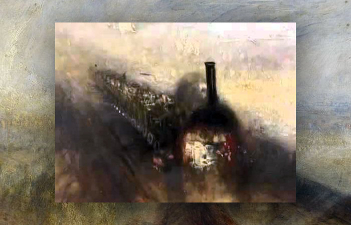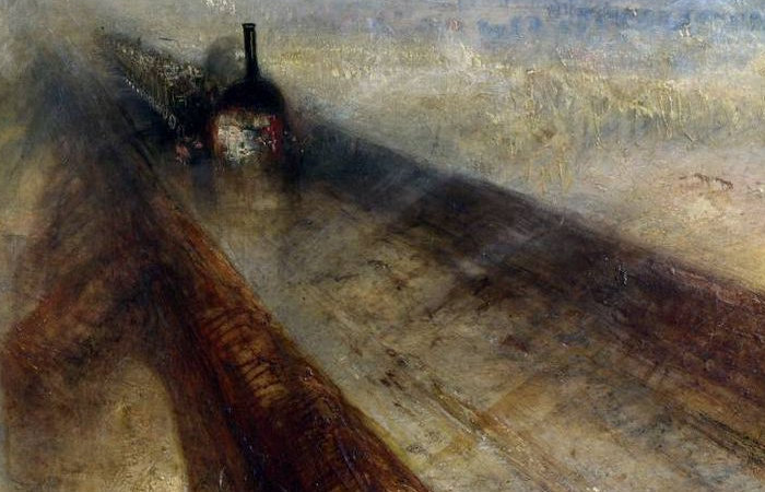 1844年,威廉·特纳(William Turner)创作了《雨、蒸汽与速度》,这幅油画表现了风景画的雄伟高峰。这幅画是机车在暴风雨中飞过一座桥的抽象景象。在特纳的画中,雨与火车产生的蒸汽和烟雾融为一体。有一种雾的印象,这是特纳非常喜欢描绘的景象。泰晤士河在桥下的雾中闪闪发光。黑色的蒸汽机车是这张照片中唯一锐利清晰的身影。他正势如破竹般的冲向观者。