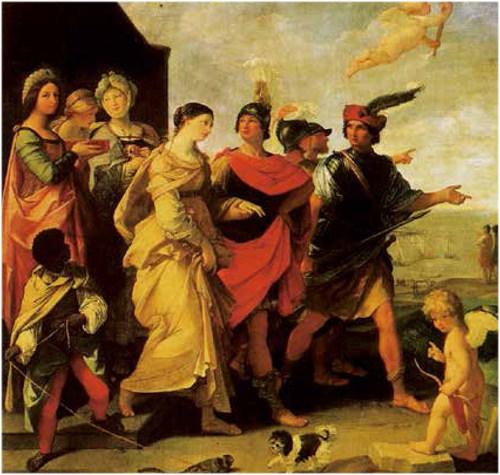 画面表现的正是特洛伊王子帕里斯牵着海伦离开王宫的场景。画中人物,无论是海伦和她的侍女还是帕里斯和他的随从们,每个人物都表现出一种优雅的姿态;人群身后远处是蔚蓝的大海和天空,得整个画面显得异常明亮;围绕在海伦周围的人物的衣着色彩鲜艳、样式复杂,这更衬托出了海伦那如白玉雕琢般的娇媚模样;而处在画面右下角的小丘比特,则回头向观者投来了意味深长的一瞥。画中那丰富、对比强烈的色彩和略显缓慢又有些造作的人物动势,使整个画面充满了戏剧化的意味,并带有明显的古典主义特点。