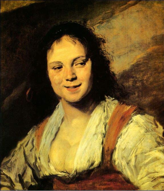 《吉普赛女郎》描绘的正是这样一位吉普赛女孩,也是哈尔斯表现平民生活的最生动的一幅佳作。画面上,女孩蓬松的黑发随意飘洒。充满魅力的大眼睛洋溢着善意的微笑,流露出清纯和无邪的本性。红晕的脸庞和微启的嘴唇张扬着青春的热情和仿佛酒意中的洒脱和奔放,也带着女性不加点缀的生命原色。敞开的领口带着不拘小节的风采,褶皱的白色衬衣、粗糙的红色的套裙,显示出了生活的困苦和流浪的艰辛。画家仿佛信手拈来,把一个带着青春气息,健康活泼、无拘无束、自由不羁的吉普赛女子描绘得清新自然,不见雕饰。