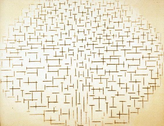 这组《海堤与海》系列作品,又被称作《加号与减号的构成》。自然的形体被简化为抽象的符号并成为形式语言,但画面仍然保留有立体派椭圆形构图的痕迹。那些短小的直线,疏密有致地布局在画面中间,而四角则空在那里。不过很快,蒙德里安便彻底摆脱了立体主义的引导,走向了他以后一直为之心醉神迷的新造型主义。为在艺术中追求自然本质的普遍规律,他耗尽了余生。