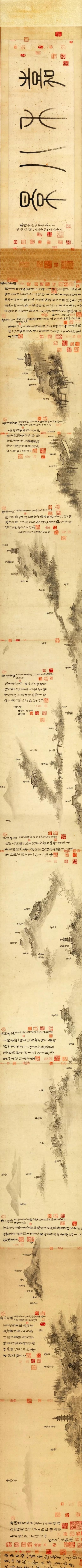 《嘉禾八景图》虽然画于一幅长卷上,但景与景之间却各个分离。同时,在这幅作品中吴镇相当注重远近距离的表达,或由位置,或由墨色,或由线条的粗细、造型的变化来显示景物间的距离、物体的厚度。其中景物虽丰,安排自各成大段落,井然有序中又不致凌乱涣散,塑造的是烟波浩渺、峰峦隐现、清旷野逸之景趣。作品中的线条沉郁稳健,在笔中表现丰富的墨韵,颇见其个性。与此同时,吴镇在画中还融入了书法的笔意,追求诗的意境。