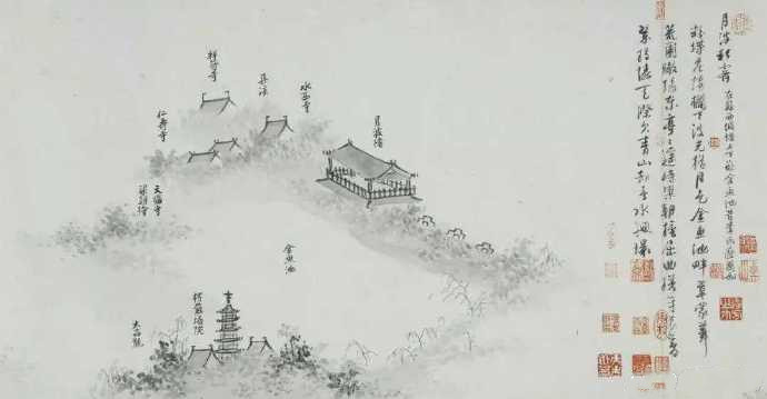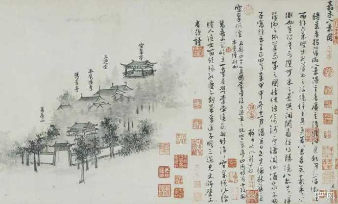 这幅《嘉禾八景图》(见图),是吴镇的一幅名作,作于元至正四年(1344),那一年吴镇65岁。此画现藏于台北故宫博物院。在这幅作品中,吴镇画了当时嘉兴的八处风景名胜,即空翠风烟、龙潭暮云、鸳湖春晓、春波烟雨、月波秋霁、三闸奔湍、胥山松涛和武水幽澜。他年幼时曾在嘉兴春波门外求学,对这里的景观十分熟悉,因此前七个景点画的都在如今的嘉兴市区和郊外,只有第八个景点在邻县嘉善魏塘。