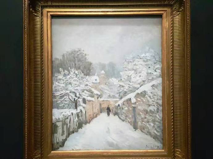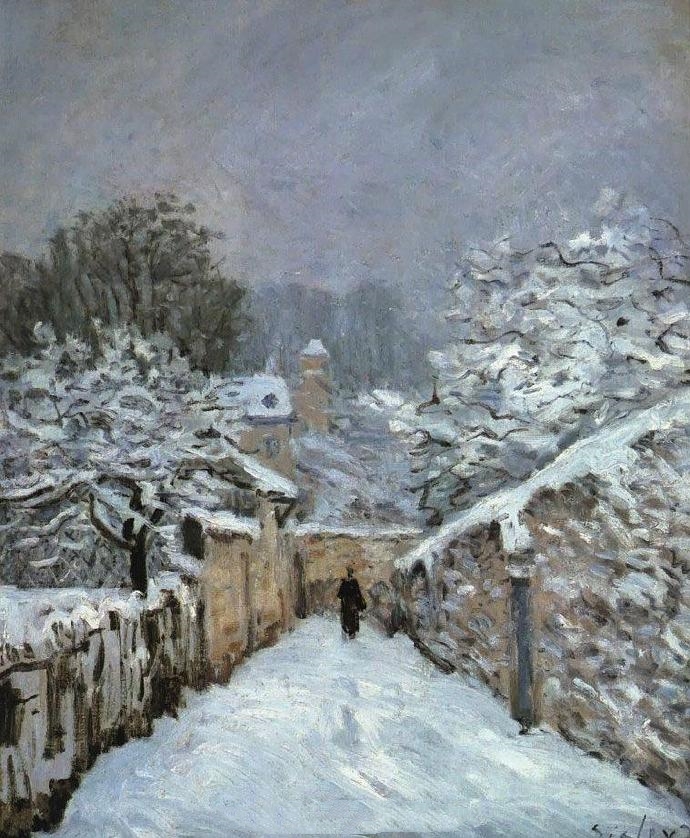 法国印象派大师阿尔弗莱德.西斯莱的《鲁弗申的雪》作品。画家曾多次参加印象派画展,他对色彩感觉特别灵敏,笔触轻快而有变化,擅长画大自然景色并且让人觉得有诗意。1870年由于家庭的原因,西斯莱从巴黎搬到了西南近郊的鲁弗申小镇。在这里他画了一系列有关小镇的画,这是他1874年画的《鲁弗申的雪》,落满积雪的树枝,远处参差不齐的房屋,加上走在雪地上发出“咯吱,咯吱”的声音,一步一个脚印,太美啦!