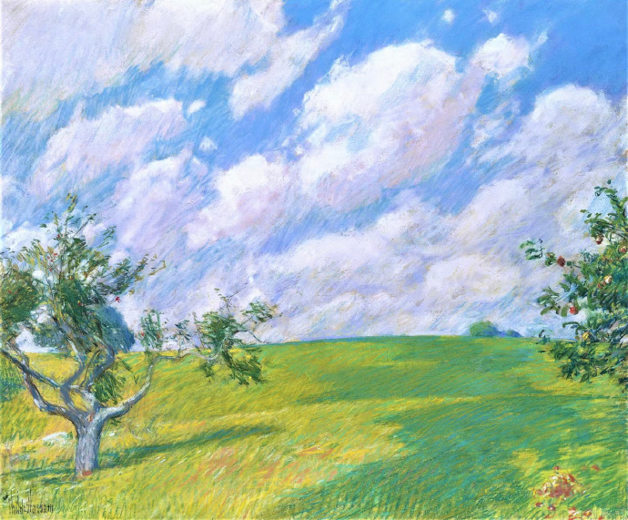 弗雷德里克·柴尔德·哈萨姆((Frederick Childe Hassam1859-1935),美国印象派画家。他生于马萨诸塞州多切斯特,母亲是纳撒尼尔·霍桑的亲戚。家里经营的五金店毁于大火后,他在一家波士顿出版商得到职位,业余时间在豪威尔研究所和波士顿艺术俱乐部学习。 1886年到朱莉安学院进修,受法国印象派影响。