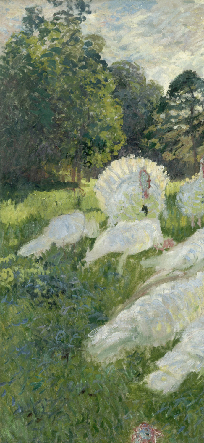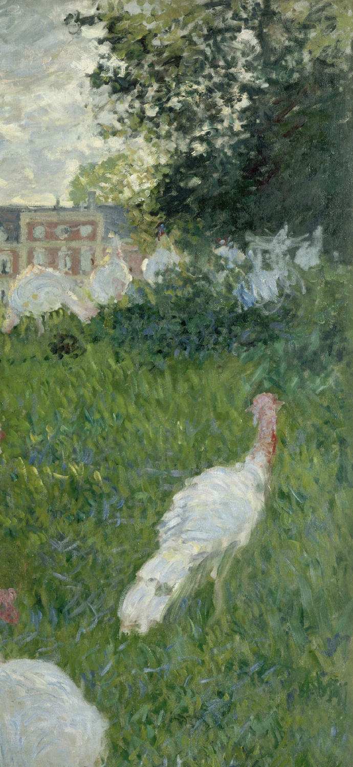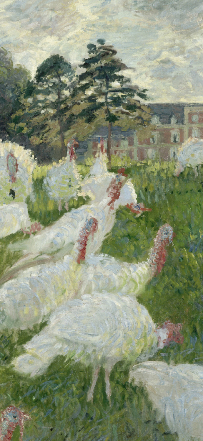 在1876年,莫奈创作了一件名为《火鸡》也叫《草地上的火鸡》的油画作品。画面描绘了一群火鸡在花园里夏日傍晚觅食的场景,色调明亮温暖,火鸡们活灵活现地围在一起探头探脑。这幅画仿佛在述说着一个平常的下午,仆人会走到农场边挑选火鸡,并筹备一桌特别的晚餐。莫奈和妻子则会坐在餐桌旁,互相致谢,表达爱意,留下一份温馨美好的回忆。